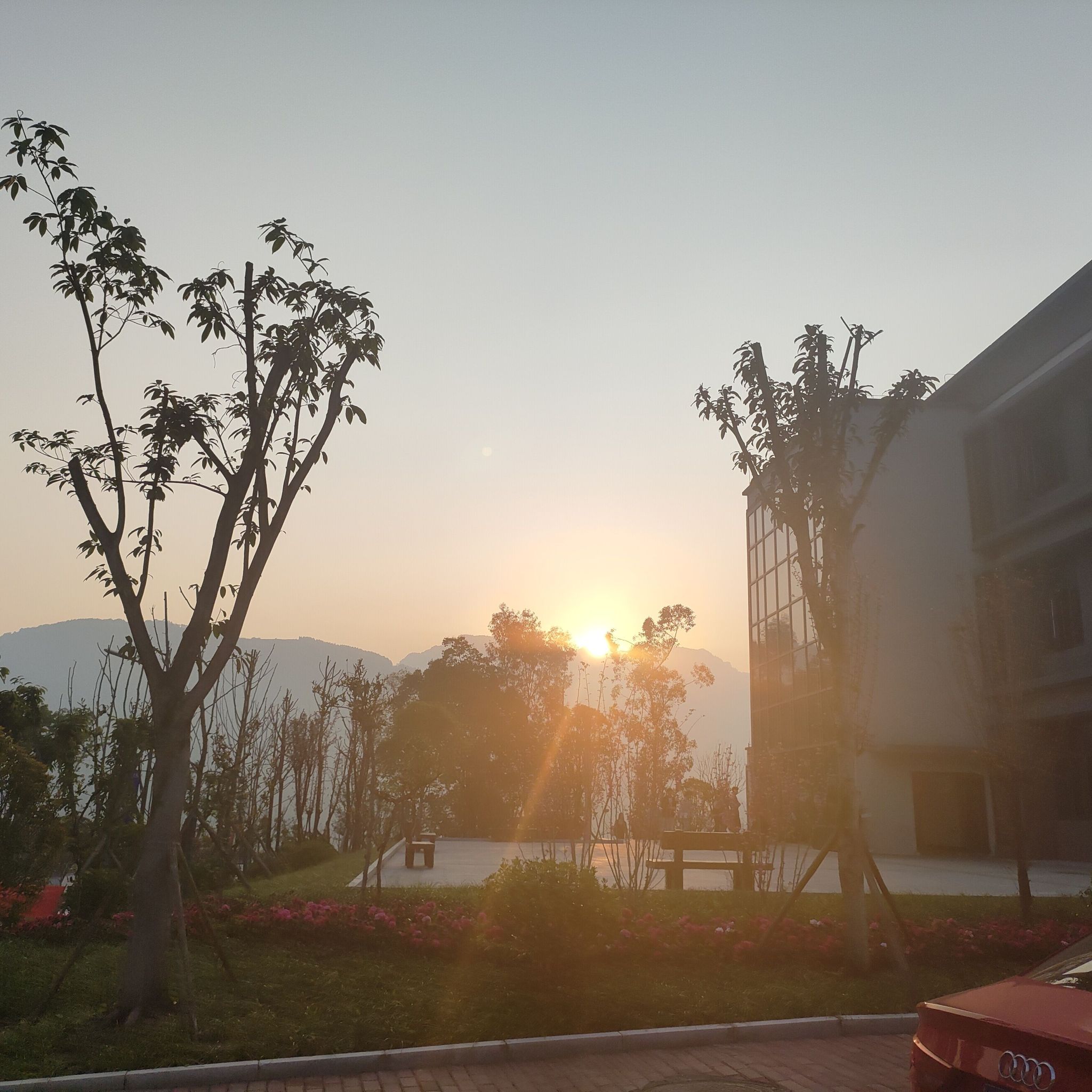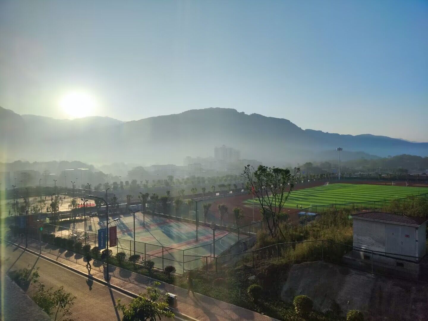 点 评:一缕阳光投射出山和数木的形状,整个校园都充满朝气,到处都是生机勃勃的模样。