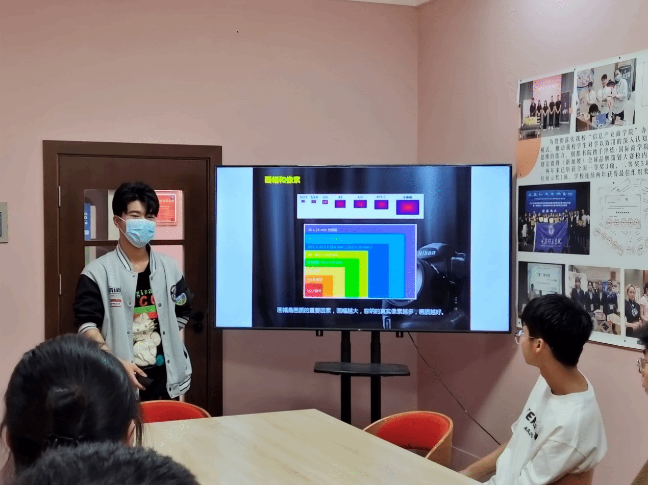 什么是相机,相机的类别区分、相关名词、如何使用,第三位分享的同学向同学们科普什么是相机三要素:快门,光圈,感光。关于摄影,第三位同学向我们说:“简单来说,摄影,就是按下快门,不过在按快门的基础上再加亿点细节而已。”游刃有余的向大家尽情讲解着摄影知识,PPT上的文字在第三位同学的讲解下也开始变得生动起来。