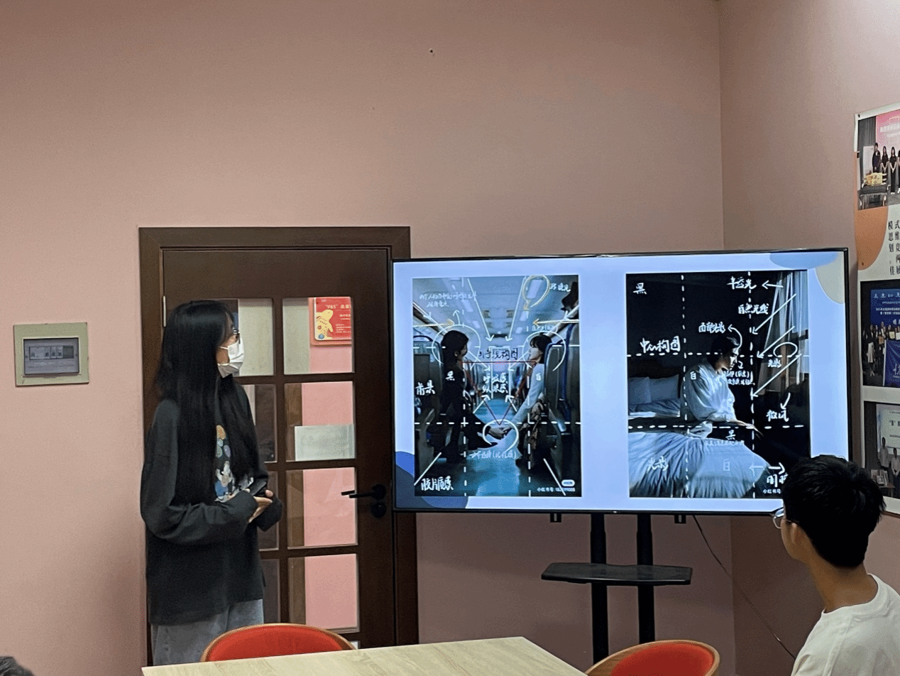 活动伊始,第一位同学为大家讲解在摄影成片方面关于构图和图片表达情感的相关概念。图文并茂的解说下,同学们目不转睛的接受着新知识的扩展。如何设计拍摄场面的构图,如何在构图中表露出每张图片蕴含的情感,为了更好的让大家理解构图的奇妙,第一位同学在PPT中分享九份常见构图,受益匪浅。