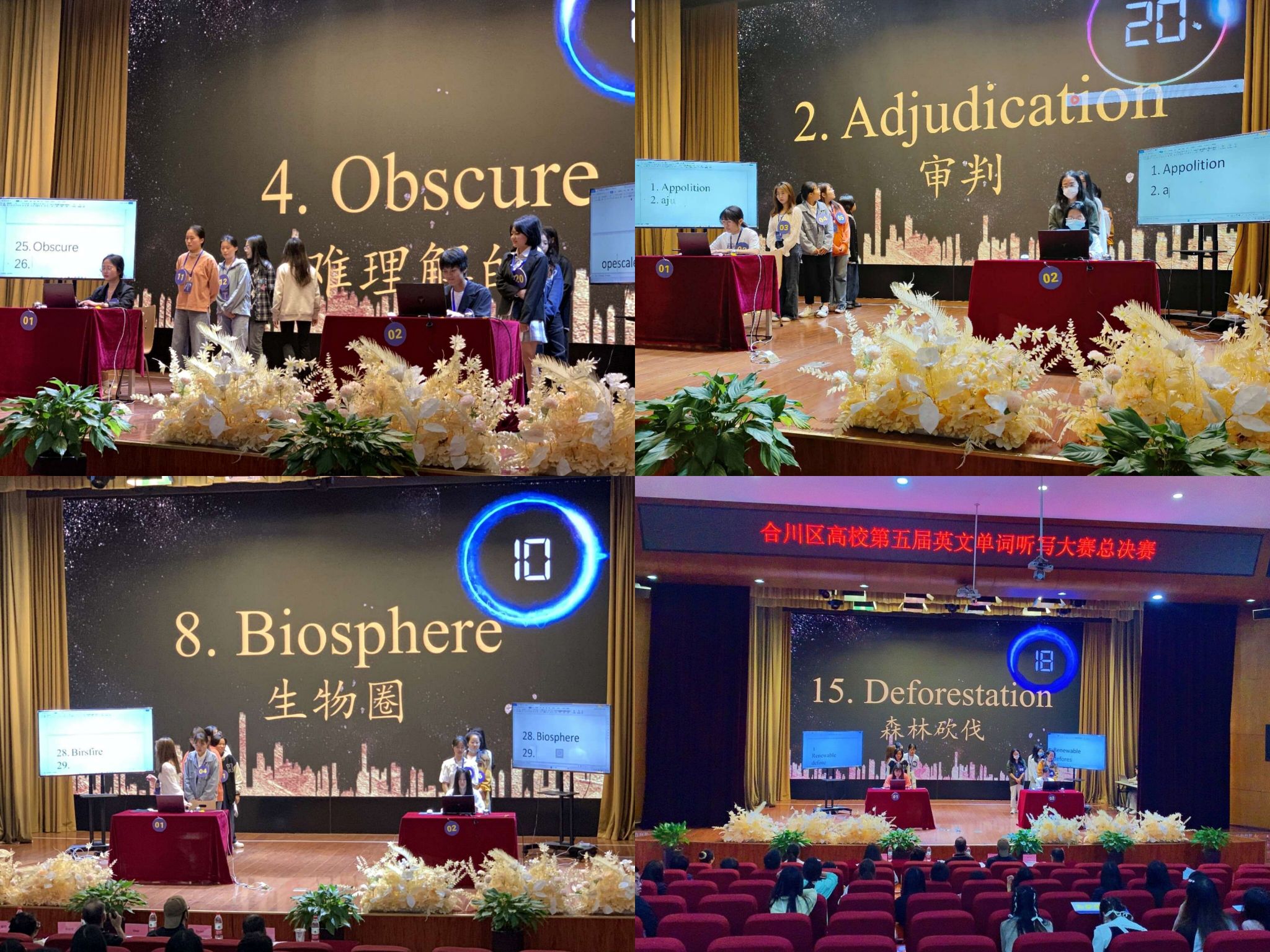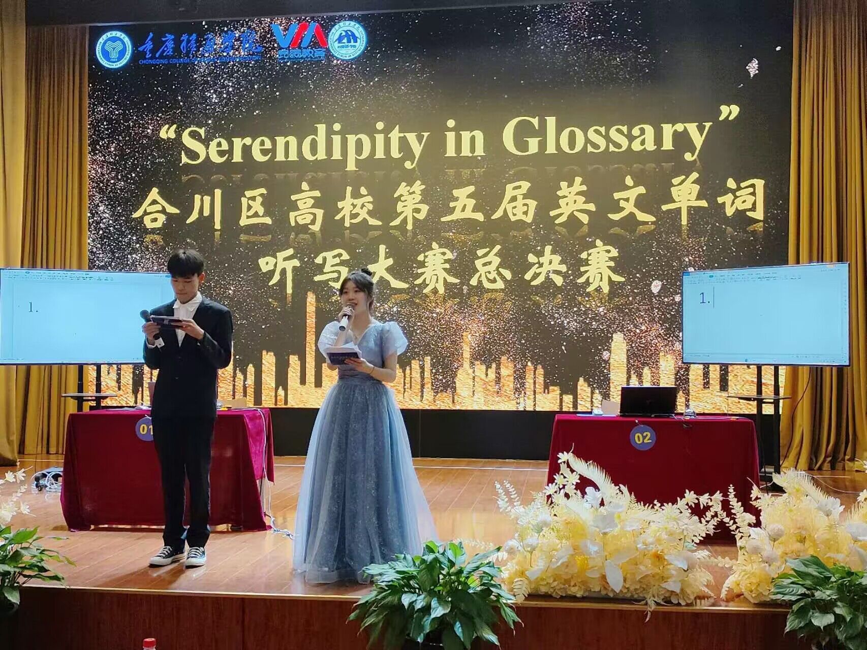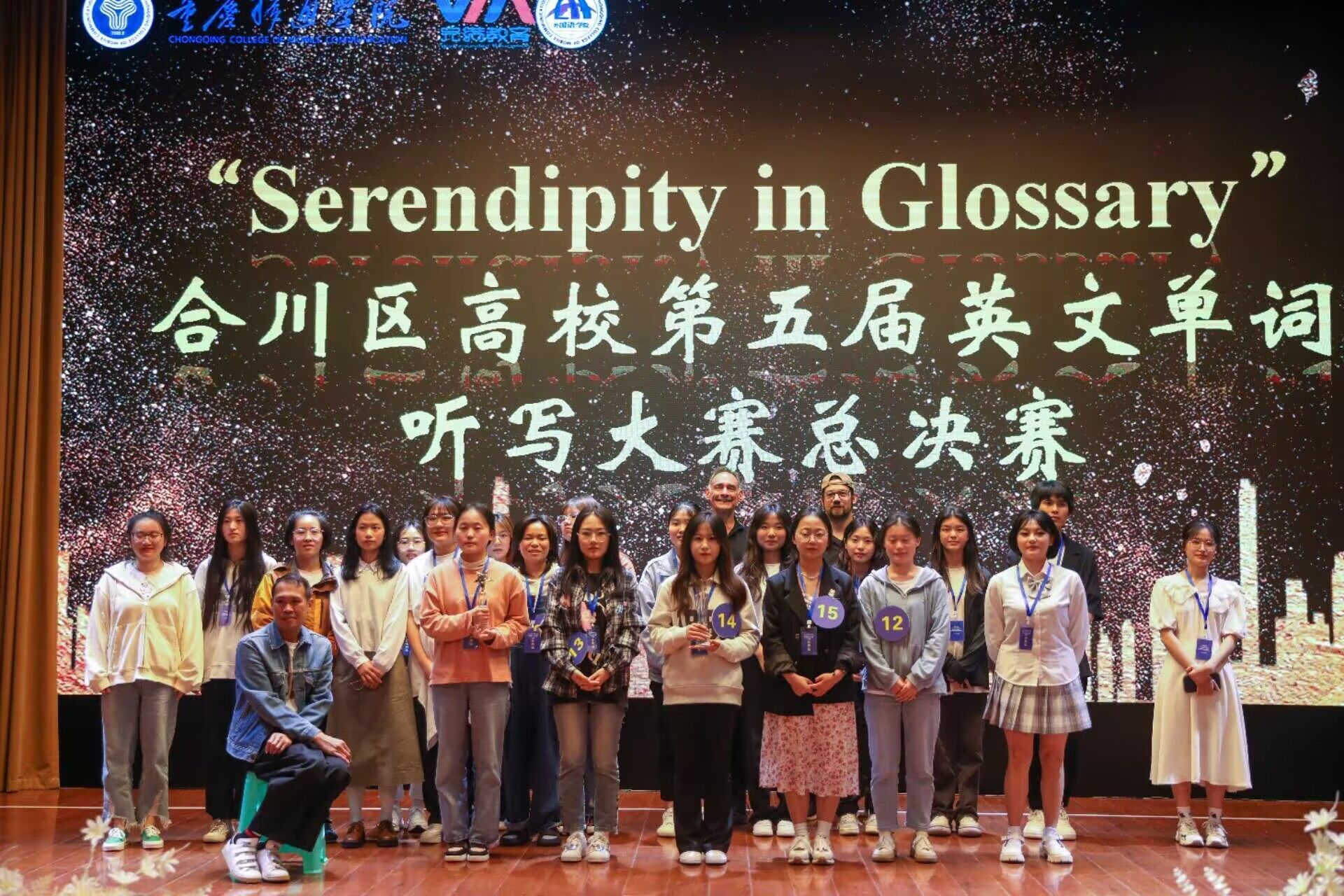五月的天,阳光明媚和蔼,不经意的透过薄薄的云层,化作缕缕金光,洒遍大地,留下了款款热情。英语在当今社会显得愈发重要。为了培养同学们学习英语的兴趣,积累英语词汇量,合川区高校第五届“Serendipity in Glossary”英文单词听写大赛于2023年5月10日14:30在下里巴人剧场举行。本次大赛特邀外教Clive,Israel,Marvin以及校团委杨婕老师和科幻学院孙丽梅老师作为评委和嘉宾。此外,参与本届合川区高校英文单词听写大赛的高校有重庆工商大学派斯学院、重庆应用职业学院、重庆对外经贸学院以及重庆移通学院。希望同学们能够在听写中获得成就感,同时也要在竞争中找到自己与别人的差异。能够知不足而奋进,望远山而前行。