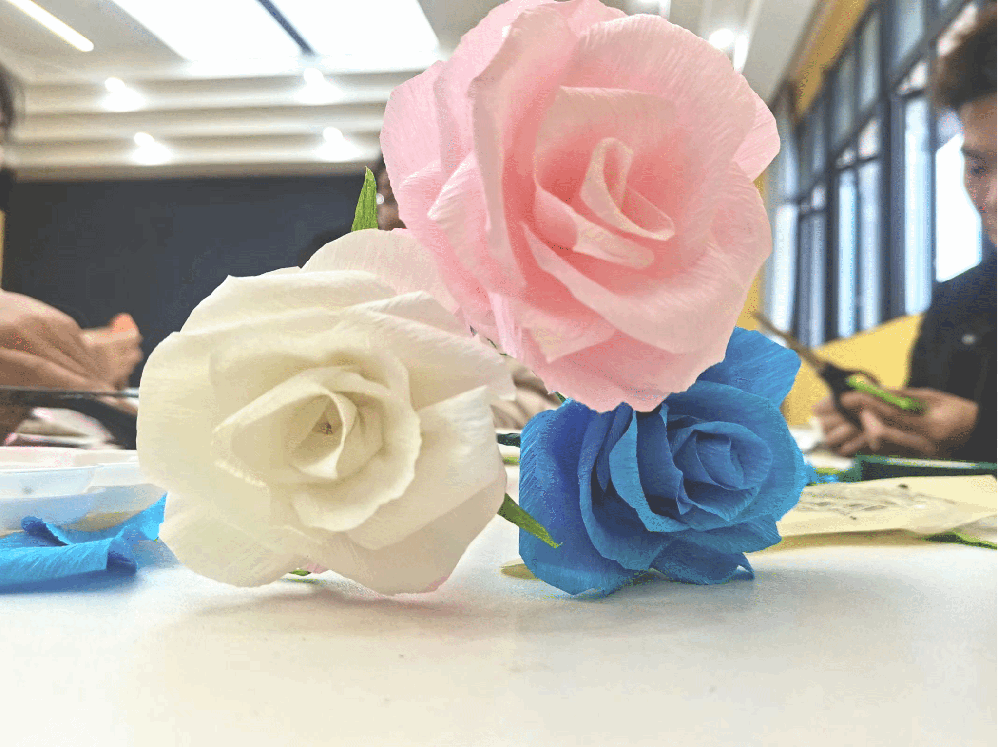 此次活动同学们在欢声笑语中开启制作花束的奇思妙想,在心灵手巧下完成一朵又一朵栩栩如生、姿态万千的纸艺花,最后携带作品欢笑合影离场,给大家带来美学艺术的视场盛宴的同时,也提高了同学们团队合作能力与制作能力,极大地丰富了同学们的课外文化生活,让同学们深刻体会了传统非遗文化其中的韵味内涵,增强了对于传承非遗文化的意识,同时期待与同学们的下一次相遇。