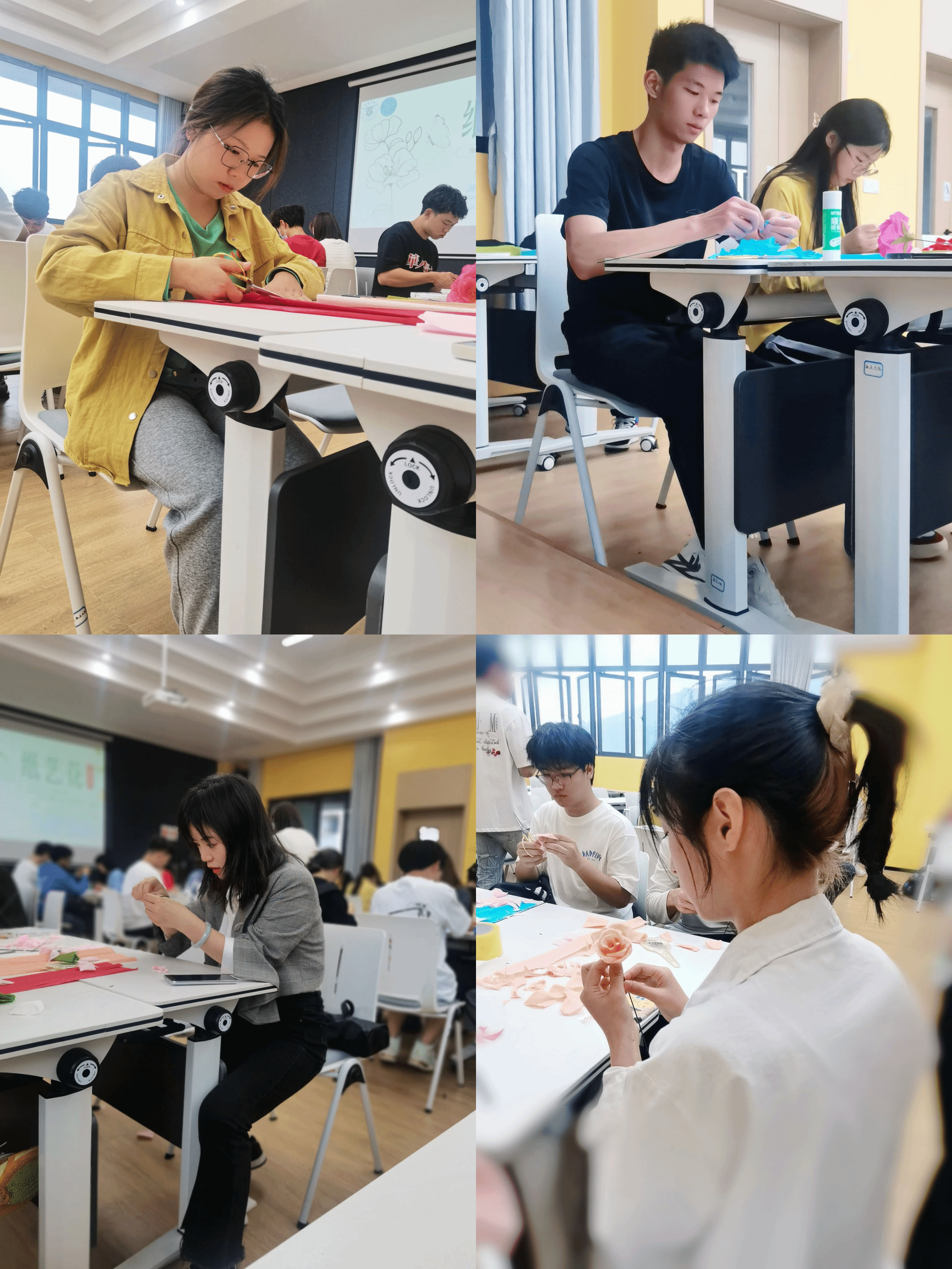 非遗传承系列一“指尖技艺,灵动之花”纸艺花制作活动于5月10日15时在瀛溪书院回声报告厅顺利举办,活动邀请到大健康管理学院彭丽珺老师指导同学们现场制作简单纸艺花束,让同学们亲身感受纸艺花的趣味与魅力。