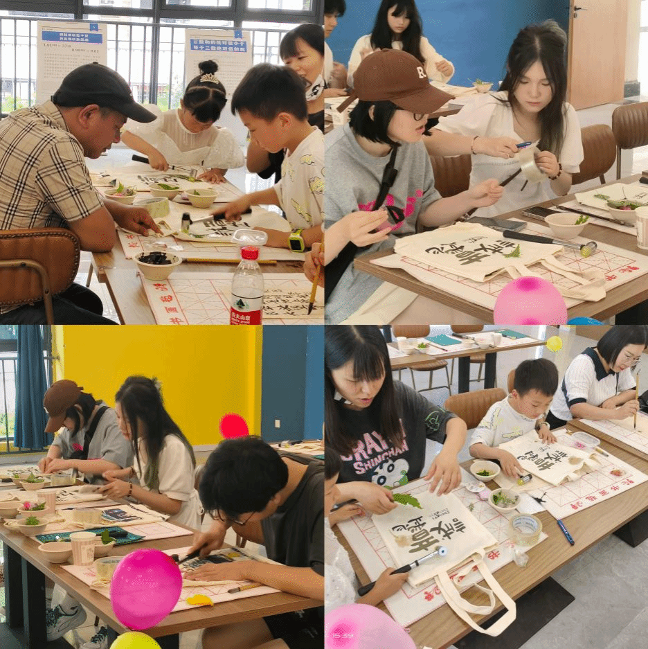 在拓印的过程中,大家都整齐地挥舞着手中的小锤,将树叶一点一点印在帆布袋上,通过充分的捶打,树叶的形状纹路便牢牢地印在了布料上,这也仿佛是将自己对母亲的爱意牢牢地印在心中。一声声沉稳的敲打,更像是孩子在母亲腹中的胎动,承载着母亲对孩子的期待;一朵朵浪漫之花,像是孩子对母亲思念的寄托,饱含孩子对母亲的爱意。在这个特别的日子里,用捶声模拟心跳,用图案将爱意拓印。