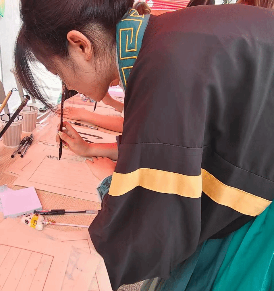 “谁言寸草心,报得三春晖。”借用孟郊的诗句,诉说着对母亲的感恩之情。母亲也曾是别人的子女,过着无忧无虑的生活,但是为了孩子,她们挑起了生活的担子。她们的脸上全是岁月留下的痕迹,时间将她们的脊梁压弯,将她们的头发染白。为了强化学生的感恩意识,提高他们的社会责任感,5月14日是重庆移通学院市民开放日又恰逢母亲节,因此“青花墨字”书画社于图书馆前的微风广场开展了“翰墨飘香,书笺寄情”——书法主题创作打卡活动。