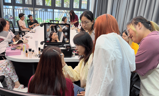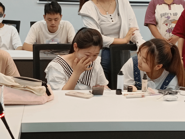 底妆作为整个妆容的基础,利用粉底液、遮瑕、粉饼等底妆产品来调整和统一整个面部肤色,均匀肤色,还可以遮盖面部上一些痘印、瑕疵,打造出一个无暇肌肤,妆容是否干净的关键也在此。而清透、无暇的底妆,更是人们一直在追求的效果。底妆作为彩妆的基底也变得格外重要。而如何打造无暇底妆成了一大难题。有幸的是在此次活动中王佳老师为同学们解开了这个难题,王佳老师指出:大家在上底妆前要做好保湿工作。为了让同学们对上底妆的手法和步骤了解更清楚,王佳老师请模特来作为示范,一步一步教大家正确的上底妆。同学们也在老师的带领下拿起化妆品,积极的实操起来。现场非常热闹,画面极其和谐。
