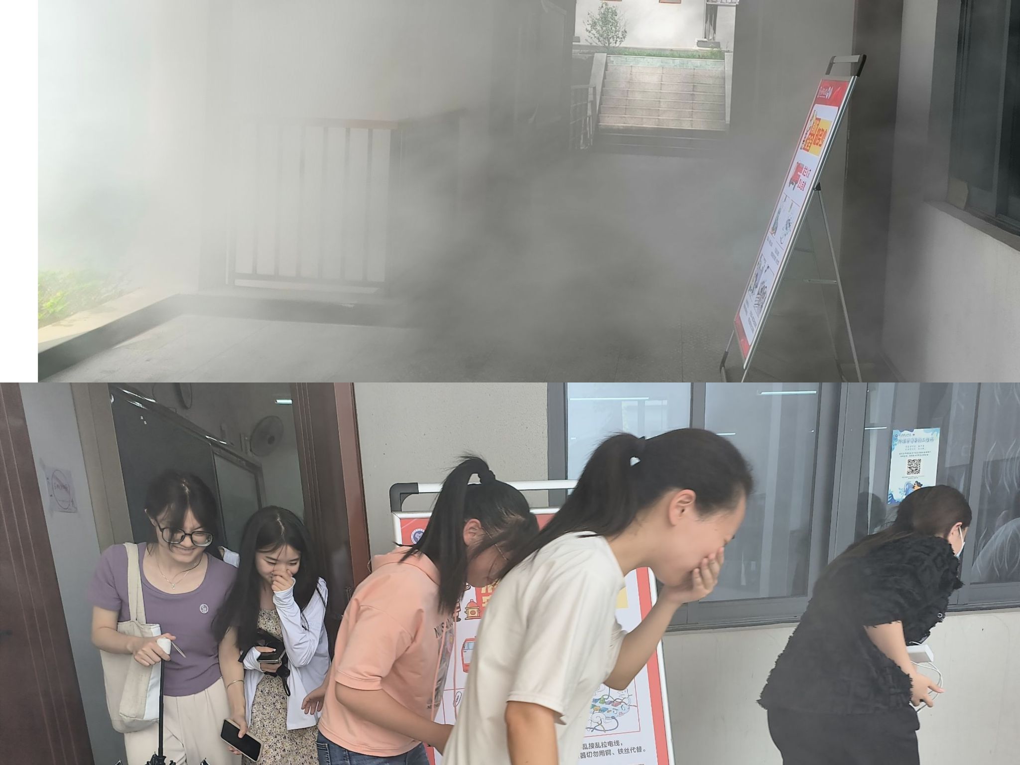 下午3点30分,杨教官点燃烟雾弹,模拟火灾初发时的情景。大家在杨教官的引导下弯腰、捂住口鼻,按学校消防应急疏散预案路线,迅速有序地撤离到“安全地带”。到达指定位置后,马上清点人数并向现场指挥汇报。演练按预案进行,整个过程既紧张、激烈,又有条不紊。