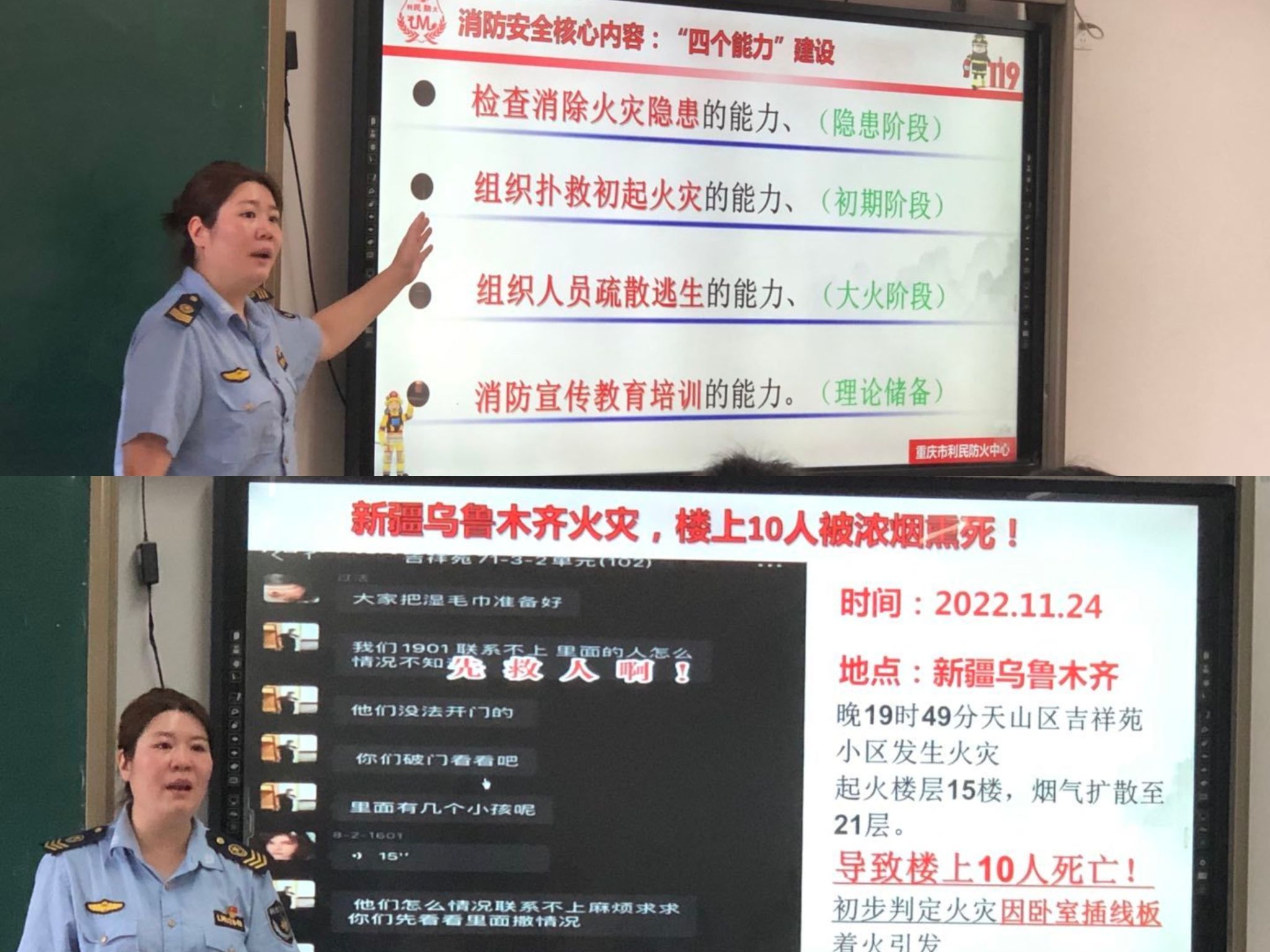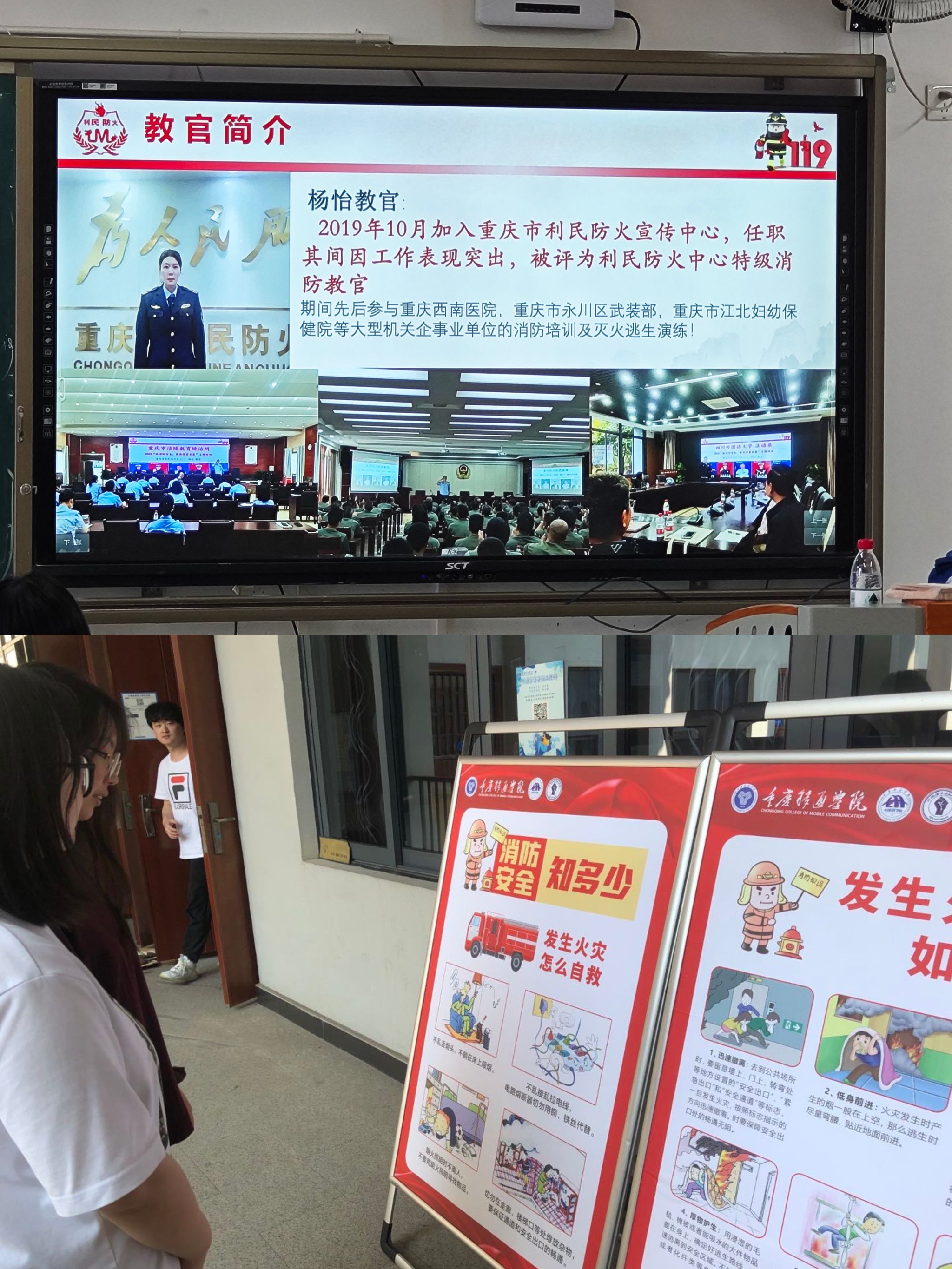 主讲人杨怡教官,被评为利民防火中心特级消防教官,期间先后参与重庆西南医院、重庆市永川区武装部、重庆市江北妇幼保健院等大型机关企事业单位的消防培训及灭火逃生演练。