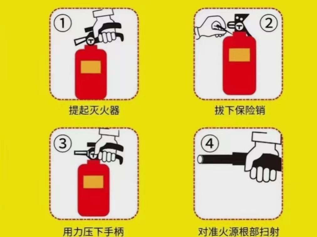 火情初发生时,火势不大,尚不会对人造成威胁,且附近有可用的灭火器材时,应及时扑灭小火,以防酿成大祸。灭火器的使用方法十分简单,只需要记住“提拔握压”四字口诀。火灾发生后,浓烟致死率要远高于火烧致死率,为防止中毒和窒息,撤离时可佩戴火灾面罩、或用毛巾、口罩等豪住口鼻,遇到浓烟需佩戴防毒面具,弯腰低姿态撤离。