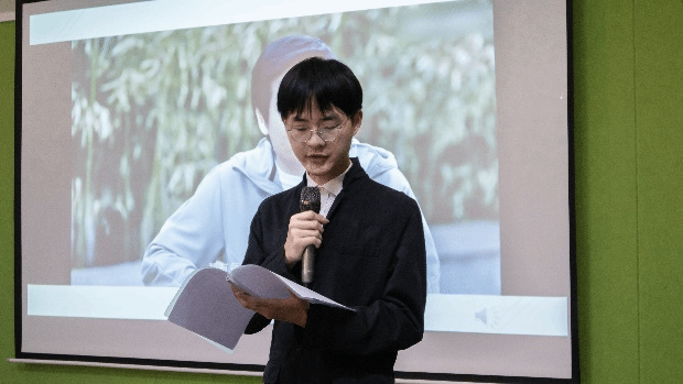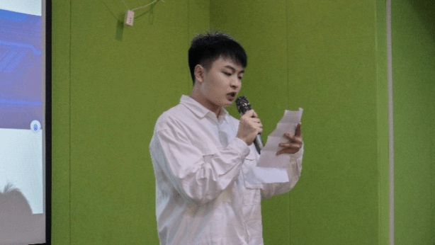 肃肃花絮晚,菲菲红素轻。春去夏至,时光匆匆流逝,在主持人温润如风的开场中,本次大咖经典朗诵大赛正式拉开序幕。首先为我们带来大咖经典朗诵的是来自2022级大数据管理与应用专业王晨玓同学,为让现场师生更好的理解他的所思所想,王同学从《至暗时刻》的简介、片段选读、实例展示等多个方面为大家进行了详细的介绍,朗朗读书声中,传述出的理念令人深思,王同学提出我们都应如书中的丘吉尔一样,无论遇到何种困难与艰险,都绝不动摇、胆怯,绝不向命运投降,持续斗争到底。