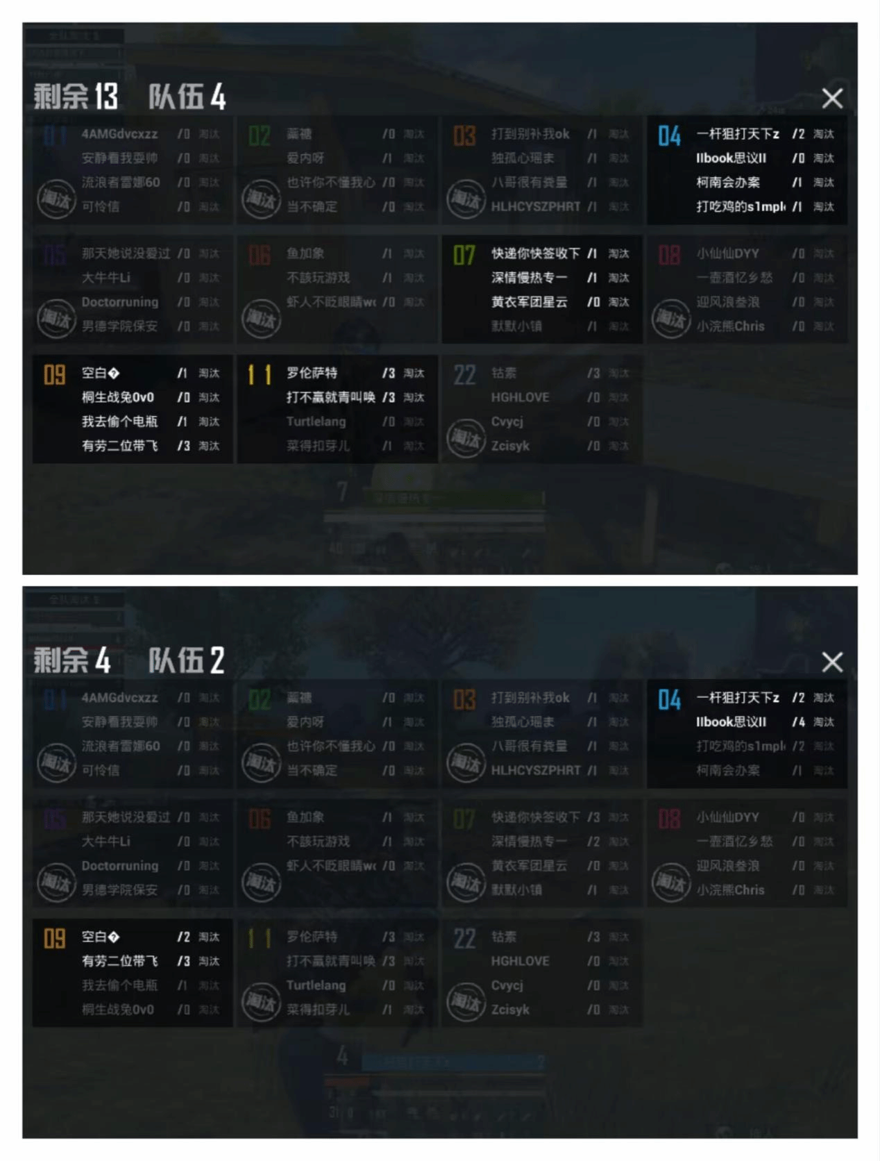 初赛开始前,每一支队伍都在认真讨论着自己的计划和攻守方式,是选择核心地带,凭借高超的技术来碾压对手,还是选择边远地带,远离斗争坐山观虎斗,最后成为得利的渔翁。比赛开始后,每一位选手的精神状态高度集中,路过的每一个地点,都会认真审查周围是否有敌人然后搜索资源。凭借他们各自以往的经验以及队伍的精心策划,最终每一位选手都获得各自心爱的装备,开始角逐前十进入决赛。每位选手都激烈的展开斗争,战略资源争夺、烟雾弹躲开敌方视线、手雷干扰敌方行进路线等等。