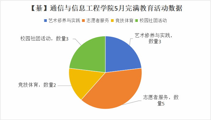 通信过程与信息工程学院完满教育APP管理小组对本院五月的完满教育数据进行统计和分析,通信与信息工程学院(綦江校区)五月份共推12场完满教育特色活动,其中校园社团活动2场,艺术修养与实践3场,志愿者服务7场,竞技体育0场,覆盖人数为1001人。
