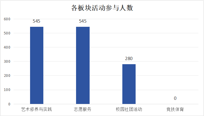 从五月的活动数据可观察出,本月的完满教育活动中,志愿者服务活动板块参与人数最高,共545人,竞技体育活动板块参与人数最少,共0人。