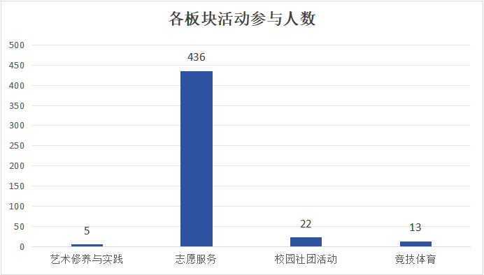 分析完满教育数据,可为组织者提供改进的方向,从本月完满教育活动数据看来,艺术修养与实践板块的参与人数较少,在下一个月,将改进相应方案、激发同学的热情,让同学们运动起来,让学生在完满教育各个板块全面发展。