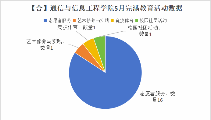 通信过程与信息工程学院完满教育APP管理小组对本院五月的完满教育数据进行统计和分析,通信与信息工程学院(合川校区)五月份共推19场完满教育特色活动,其中校园社团活动1场,艺术修养与实践1场,志愿者服务16场,竞技体育1场,覆盖人数为467人。