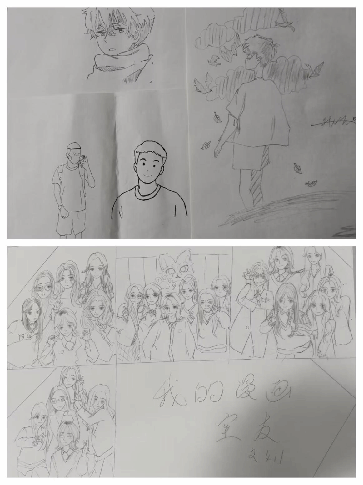 绘画是一门活跃在指尖上的艺术,需要丰富的想象力和出色的动手能力支持,同学们笔走龙蛇,不同形象的肖像画呈现于纸上。在纸张背后的小故事中,也可以看出室友间的深厚友谊。