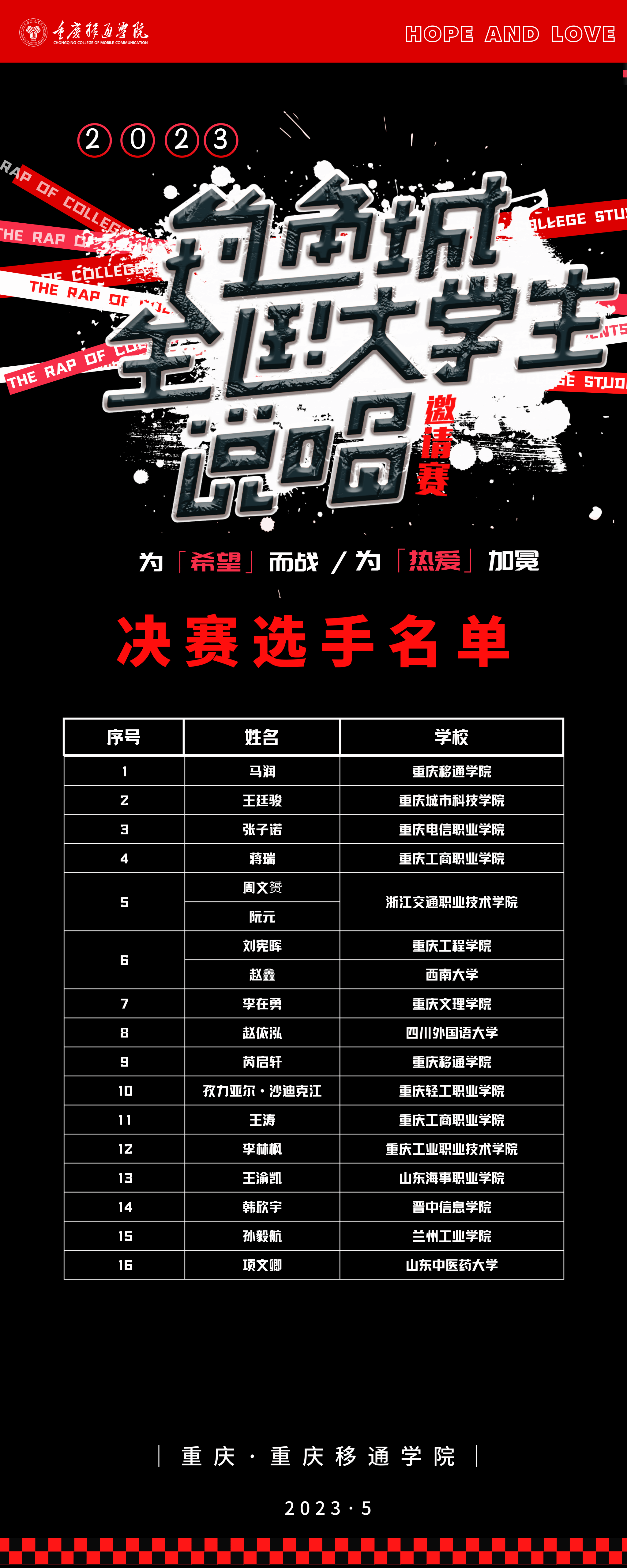 此外,从重庆市比赛到全国比赛,从2019到2023,多次赛事的设计与升级,给予更多说唱选手展现的舞台和成长的沃土,我校也致力于为为全国爱好说唱的大学生们提供一个交流与学习的平台。