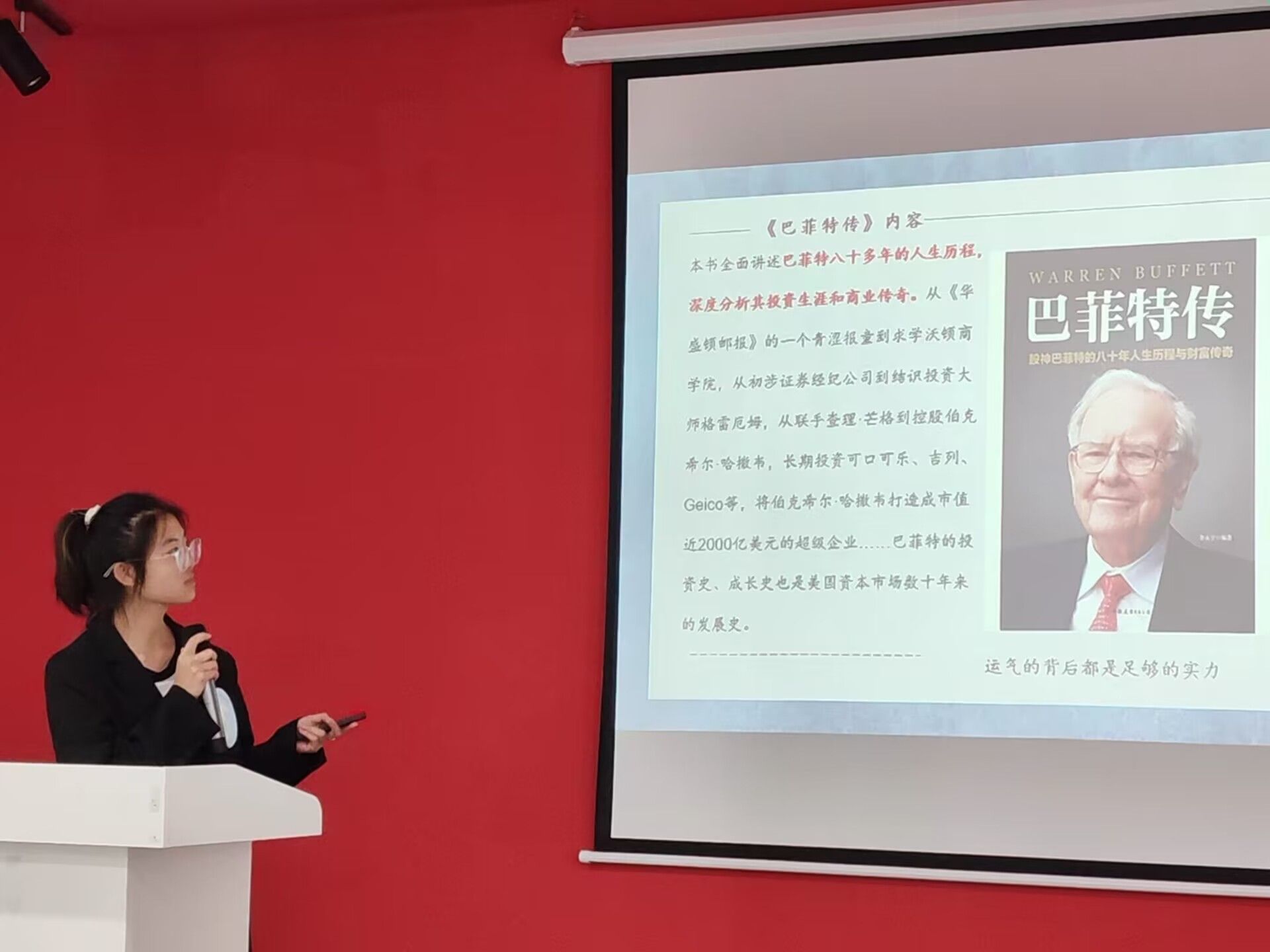 来自管理科学与工程类4班的龙雨同学对《巴菲特传》有着深刻的理解。她说“我想人物传记更大的意义是,我们可以从中看到,一个人为什么会成为我们今天所看到的样子。然后根据自己的需求,从中汲取我们所需,让自己更靠近我们所喜欢的样子。因此我们在生活与工作当中要学习这种独立思考模式,而非人云亦云,只有这样才能创新,才能创造出常人所不能及的业绩,当然切记不要走向极端,固执己见。”