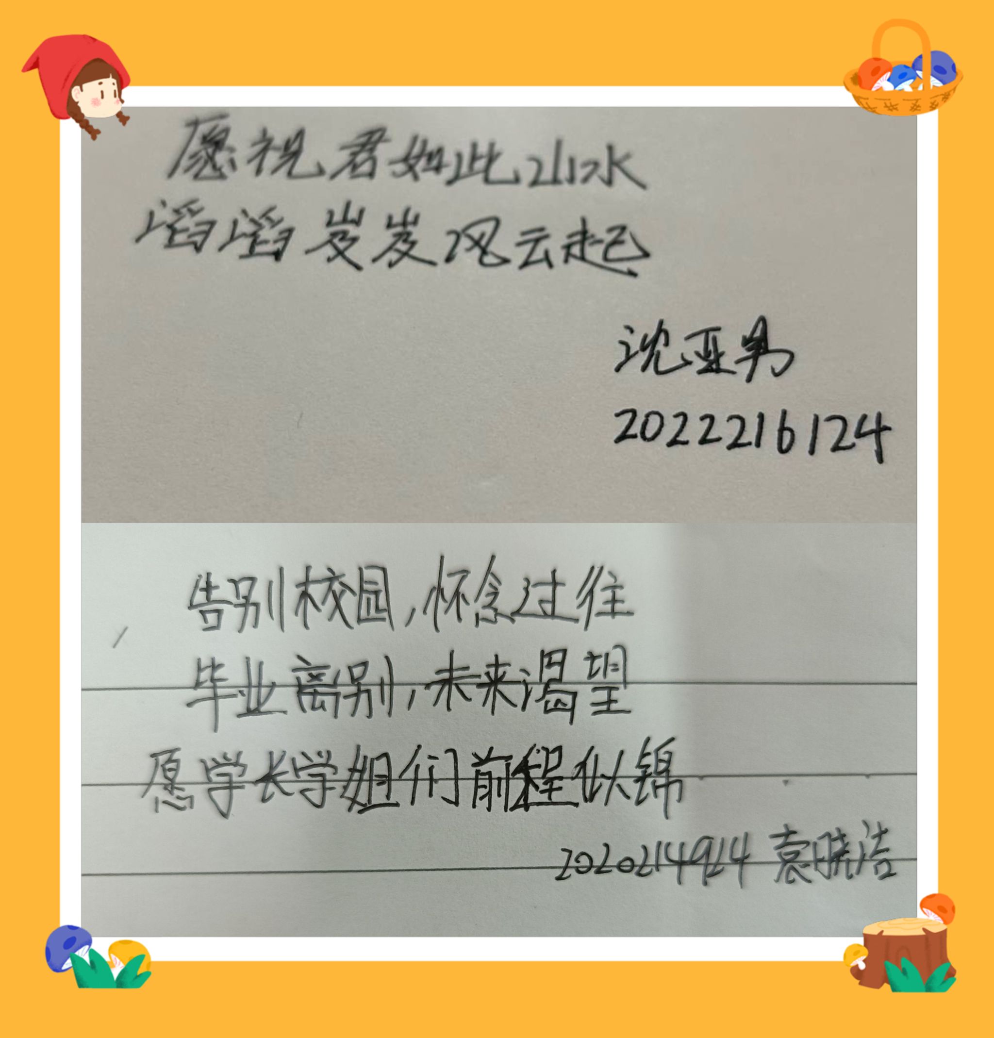 “无论未来艰苦与否,永远坚守自己的信仰,成为最好的自己,祝你们毕业快乐,生活美满!”这是2022级学生荀成刚同学写下的祝福,让我们一起共勉;“青春本来就是马不停蹄地错过和相遇,既有前程可奔赴,也有岁月可回首,望下一次相见,鲜活且明亮。”这是2022级学生段明宏写同学对青春的赞歌。青春是充满活力的,是充满幻想的。未来要靠自己去书写,去创造奇迹。这次“点缀青春,书写未来”毕业季主题活动是凝聚力的一次展现,是母校与青春的一页纸,让不同年级的同学们彼此建立了更多的联系。