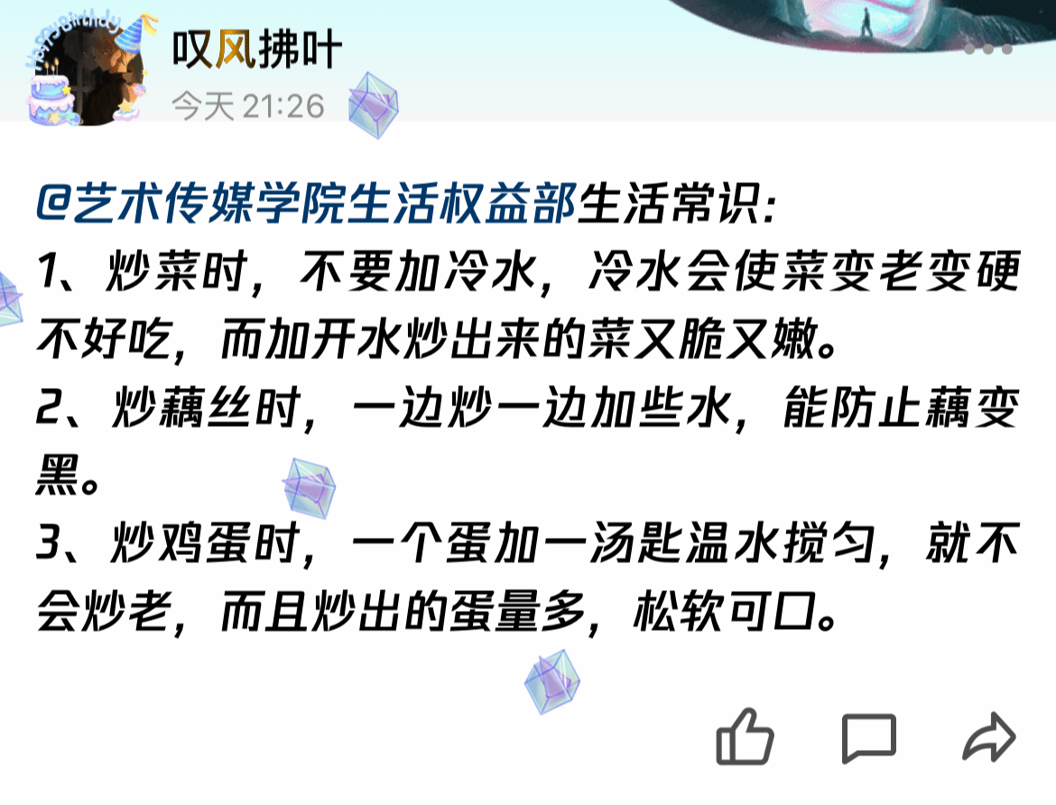 近日,艺术传媒学院在QQ空间成功举办了一场名为“我有妙招生活小巧门”的活动。本次活动旨在让大学生们分享生活小妙招,化解生活难题,提高生活效率。该活动吸引了大量学生的关注和参与,取得圆满成功。