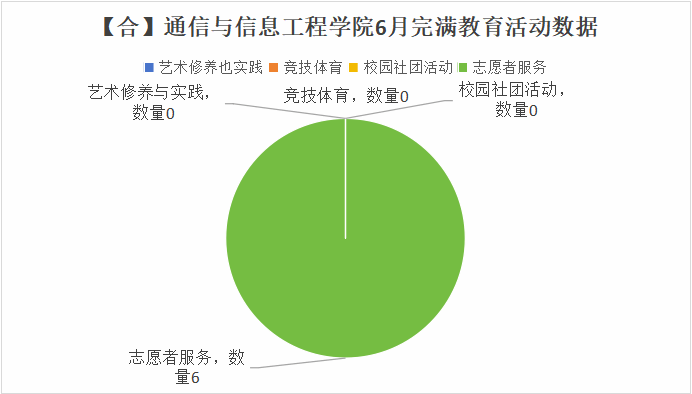 通信过程与信息工程学院完满教育APP管理小组对本院六月的完满教育数据进行统计和分析,通信与信息工程学院(合川校区)六月份共推6场完满教育特色活动,其中校园社团活动0场,艺术修养与实践0场,志愿服务6场,竞技体育0场,覆盖人数为224人。