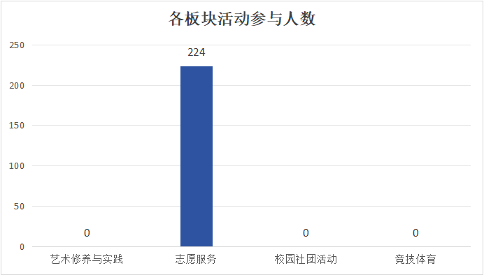 从六月的活动数据可观察出,本月的完满教育活动中,志愿者服务活动板块参与人数最高,共224人,竞技体育活动、艺术修养有实践和校园社团活动板块参与人数最少,共0人。