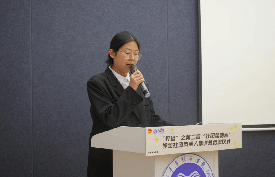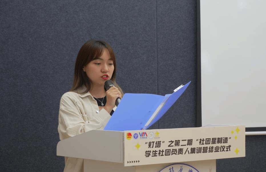 我校学生社团是以兴趣为导向、以梦想为指引,依托学生自身的兴趣特长组建的学生群体。“社团星制造”是在茫茫大海中看见天空中闪烁的一道微亮的光芒,指引你向目标不断靠近。在“灯塔”之第二期“社团星制造”学生社团负责人集训营中,学生社团负责人们互相学习、互相讨论,不断思考、不断进步,涌现出了一大批的优秀学员,他们对推动社团发展有着积极的作用。校团委蒋莉老师宣读“灯塔”之第二期“社团星制造”学生社团负责人优秀学员名单,并为他们颁发优秀学员证书。