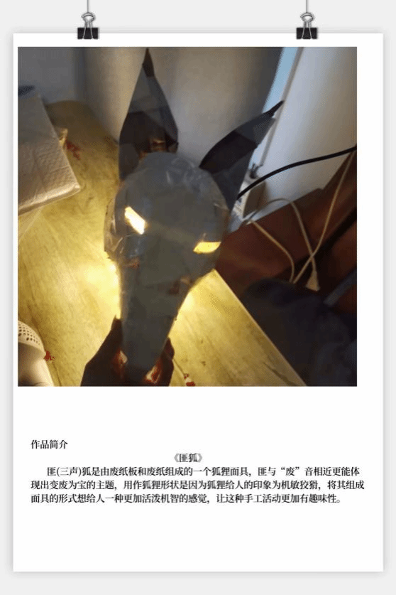 生动形象的“匪狐”面具是同学们利用废弃的纸板改造的成果。狐狸在大众的印象是机敏狡猾,同学抓住这一特点展示,尖尖的耳朵,尖尖的下巴。取名“匪狐”,利用谐音与“废”紧密联系,突现了活动主题。