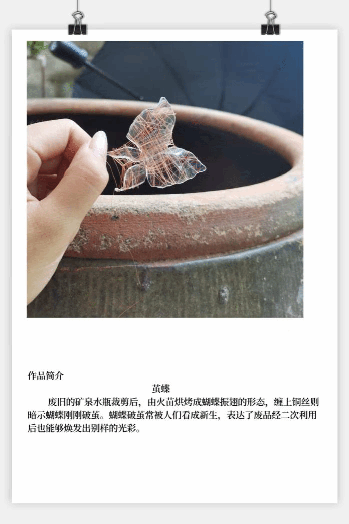 利用废弃的塑料瓶进行精心裁剪,打造成精致手工艺品——茧蝶,预示着蝴蝶刚刚破茧,而破茧又代表着新生,利用废弃物品制作新的物品,何尝不是一种新生。废物利用给了它们第二次发光、发亮机会,让人们有独特的手工体验。