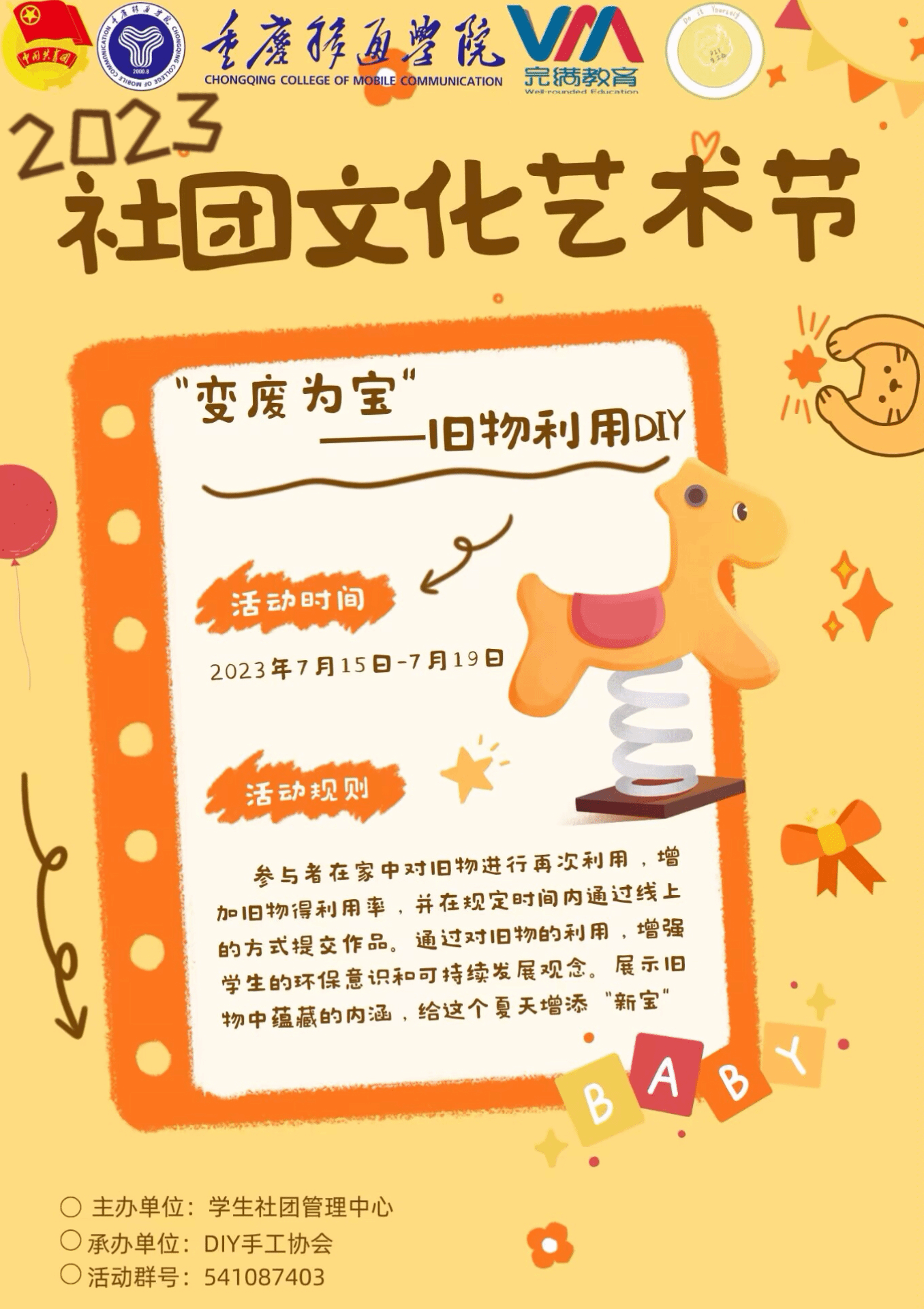 为展现当代大学生的动手实践能力、创造能力,增强学生的环保意识,提高物品的利用效率以及践行可持续发展观念。挖掘废旧物品中蕴藏的内涵,让生活更有味道。DIY手工社于7月15日在线上举办为期4天的2023社团文化艺术节DIY专场:“变废为宝”——旧物利用DIY活动。