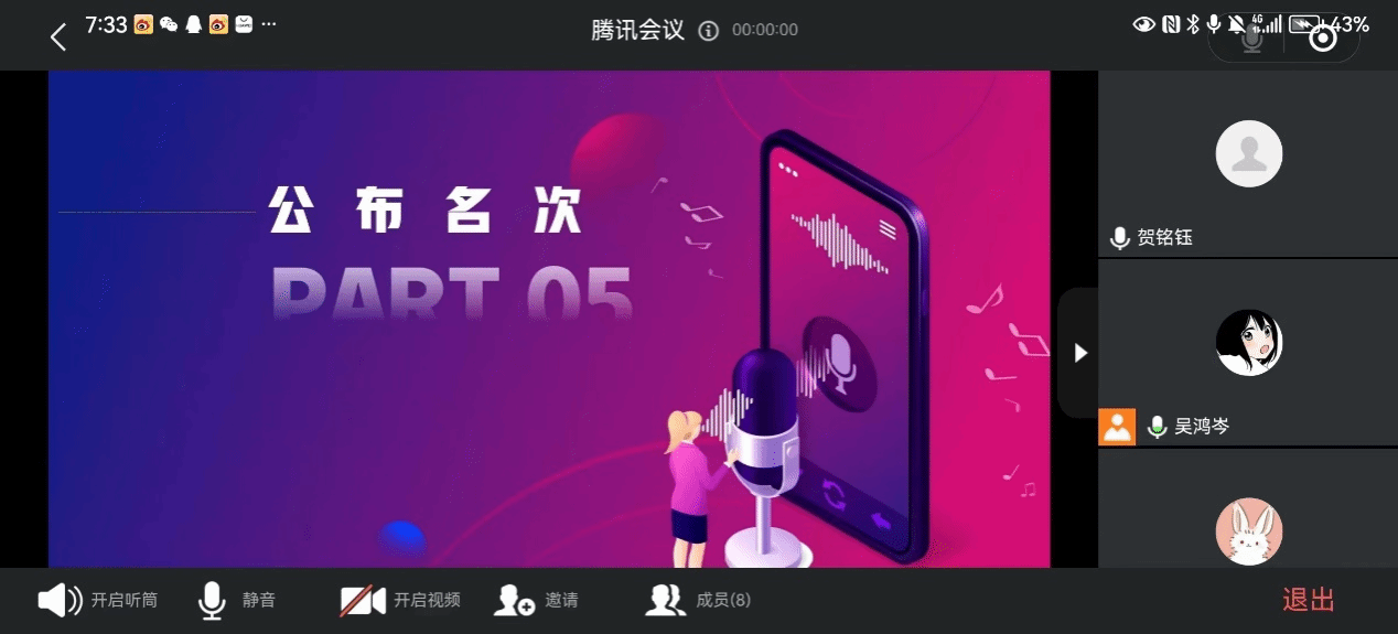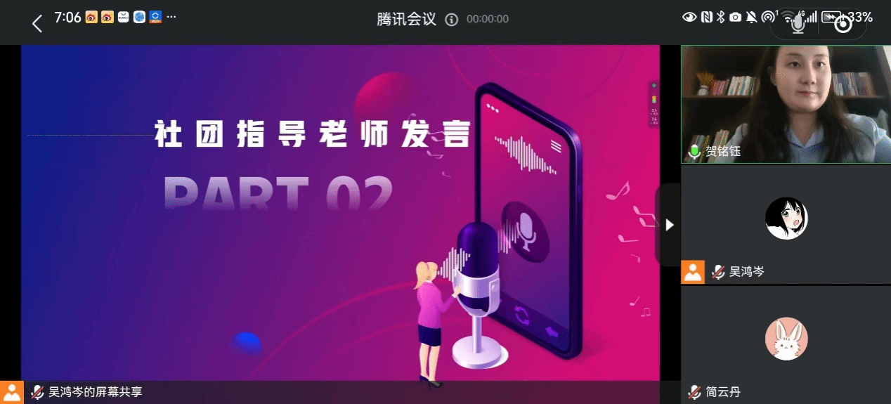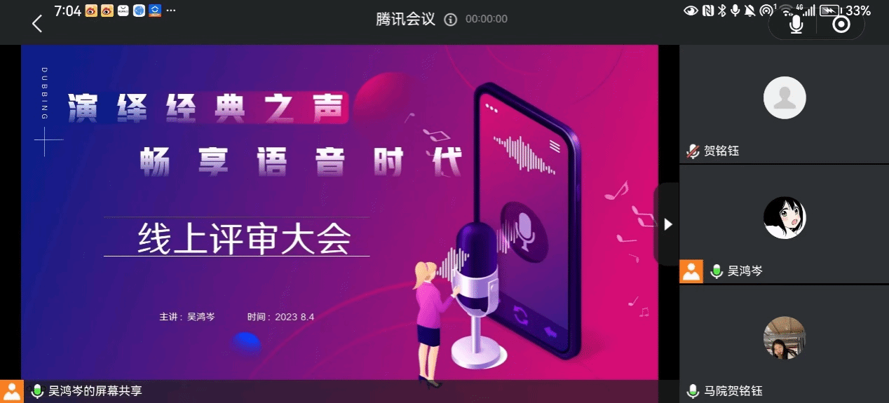 8月4日,虹雨配音社在线上举办了本次配音秀活动总决赛,由社长吴鸿岑主持,社团指导老师贺铭钰、简云丹参加,同时还邀请了我校马克思主义学院杨丽娟、郝月霜、高齐、邱秀谦、向娇,对参赛者的作品进行评选和打分,秉持严格把控,公平公正评分标准,评选出最佳配音作品。