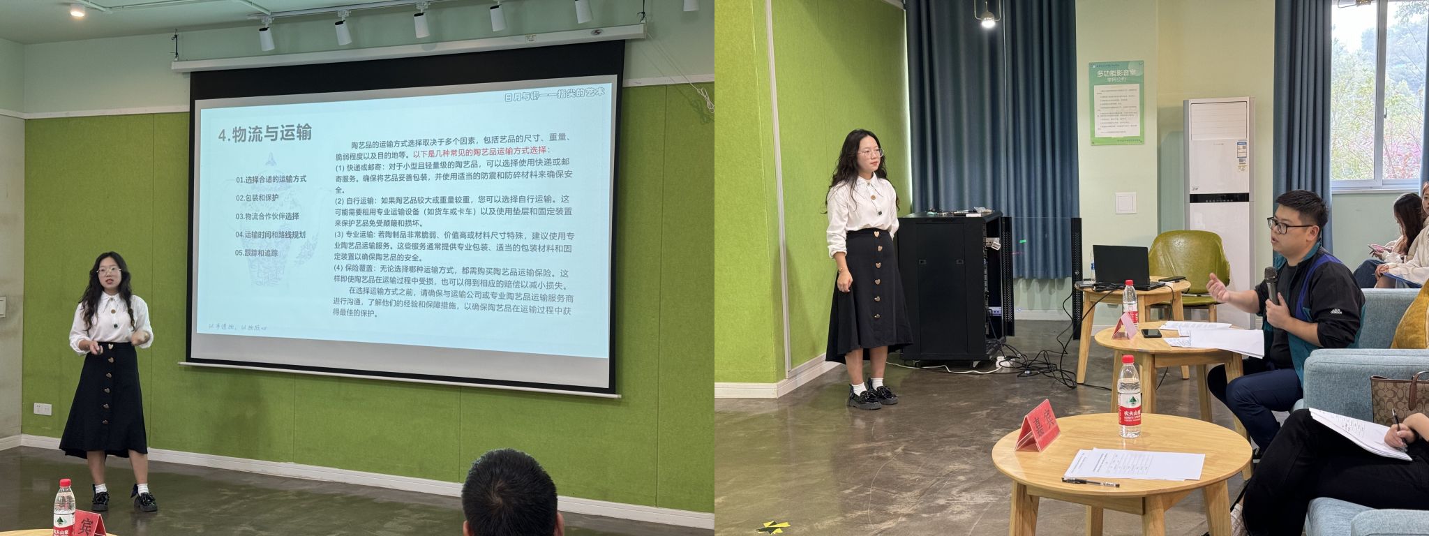 紧接着,由Books思议队作综合答辩,他们的主题是“日月与卿陶瓷工艺品”,伴随着开场音乐,答辩人从原材料、生产制作、仓储管理、物理运输、销售售后、数据分析、可持续发展、风险管理等多个方面进行了周到细致的讲解说明,她指出现代陶艺以陶土、瓷土为媒材,制造安全且不限于传统陶瓷的制作规范,具体表现在造型、烧成、釉料、展示方式各个方面,且更强调艺术家的自我意识和精神面貌,这在精神世界匮乏的当今世界是一个充满潜在市场的产业。梁同学的自信汇报,分享着她们小组的独特思考,赢得了在场师生的连连掌声,比赛氛围也在此时达到了高潮。
