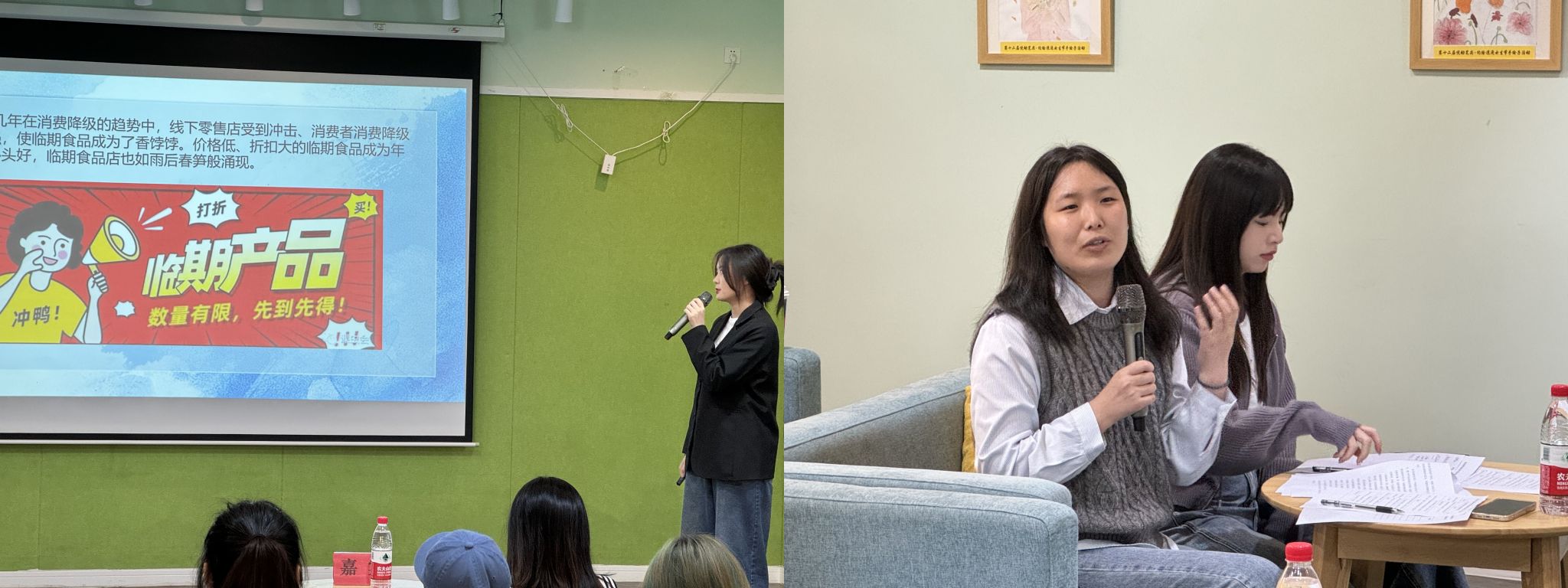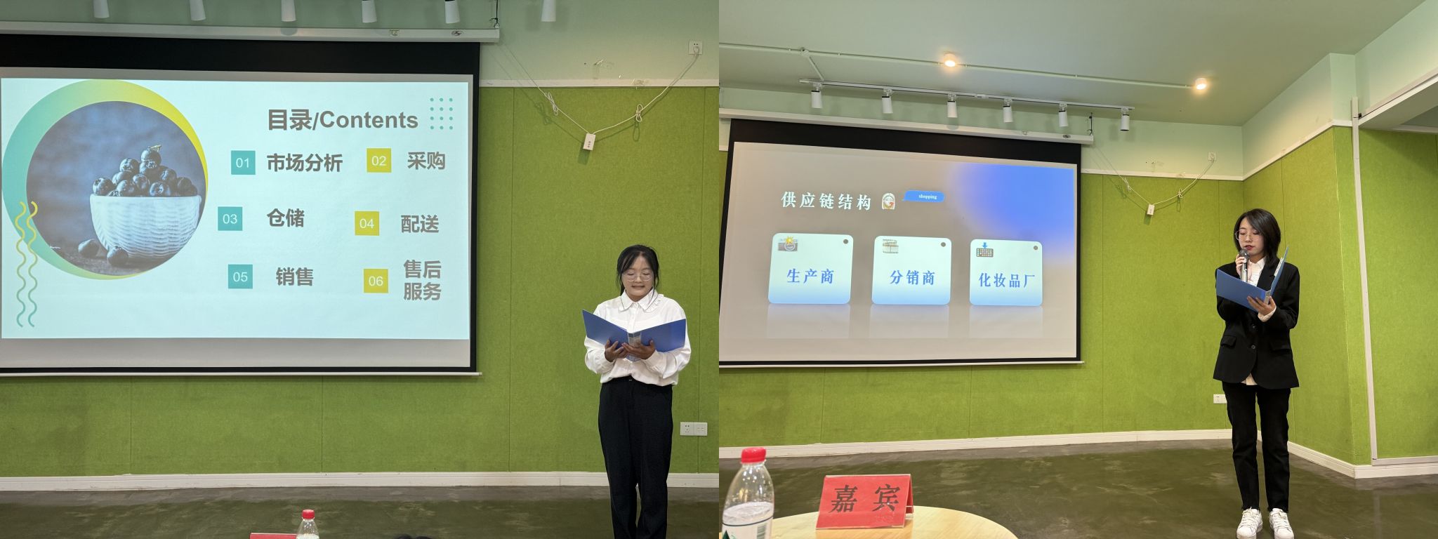 素什锦年,稍纵即逝。在主持人温润细雨般的开场话语中,本次设计大赛决赛正式拉开序幕,经过初赛的激烈角逐,共有七支队伍成功晋级决赛。首先进行答辩的是456队——临期食品,他们分别从背景、采购、销售、服务共四个方面展开阐述,并结合淘宝店铺实际案例更加通俗易懂的为大家介绍供应链方案,456队主张降低成本、提高利润、准时准点,争取为顾客提供更好的服务。
