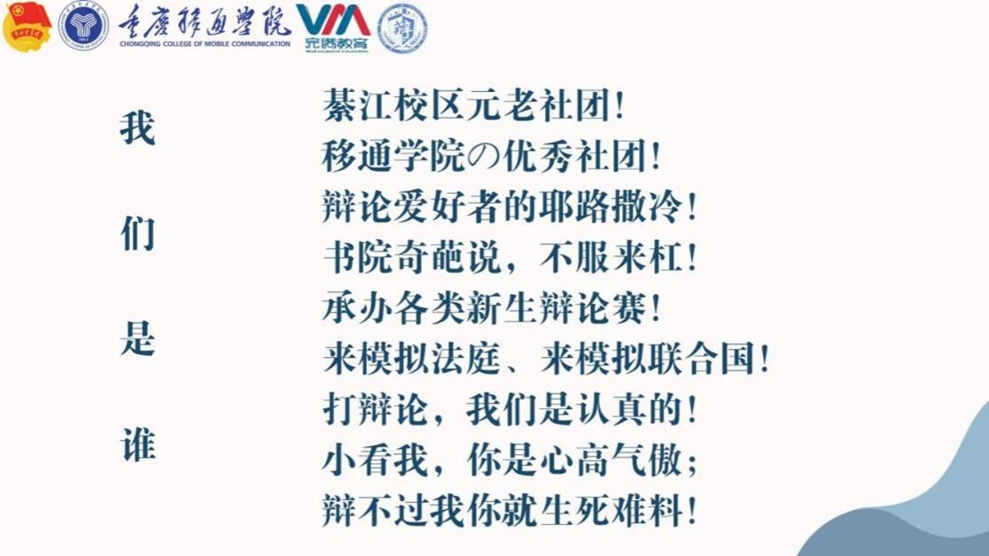 为增进最强大嘴辩论社社员间友谊,增加彼此联系与互动,加深社员对社团文化、社团特色、社团系列互动的了解,加强社团内部组织建设,增加社团的凝聚力与向心力,推动思辨文化的传播,最强大嘴辩论社于2023年10月13日19:00在古剑书院含光报告厅开展了辩论初体验暨最强大嘴辩论社见面会,见面会设置了社团文化介绍、社团风采展示、经典1v1辩论等环节,并邀请到最强大嘴辩论社辩论队的庞梦婷、罗琪、旷纹平等多位同学为新社员们做介绍、点评。