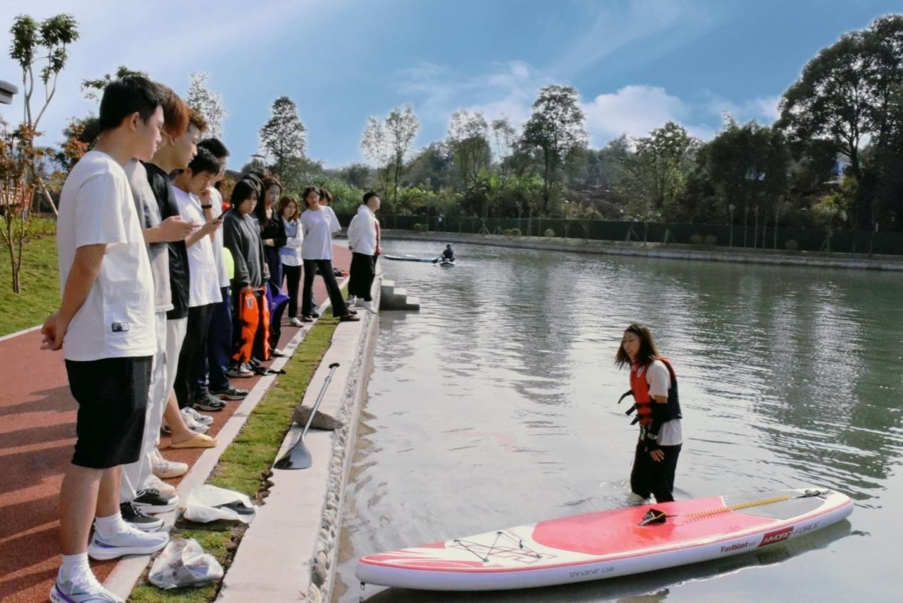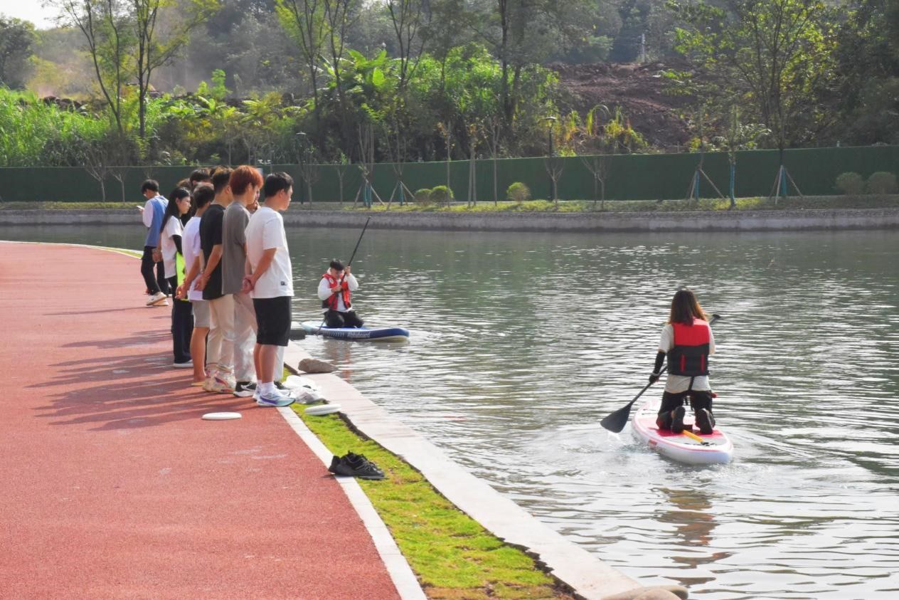 浆板运动不仅仅是一项娱乐活动,也是一种针对全身心的锻炼方式。本次“秋天已至,奔赴浆板的约”活动让同学们切身体验到了浆板运动的魅力所在。站在浆板上要求运动者保持平衡,调整身体姿势,这对身体的核心稳定性和协调性提出了极高的要求。同时,划浆的动作锻炼了肌肉力量和耐力,对于改善心肺功能和增强身体的灵活性也有积极影响。在体验浆板运动的过程中同学们即锻炼了身体,也收获了快乐与友谊。