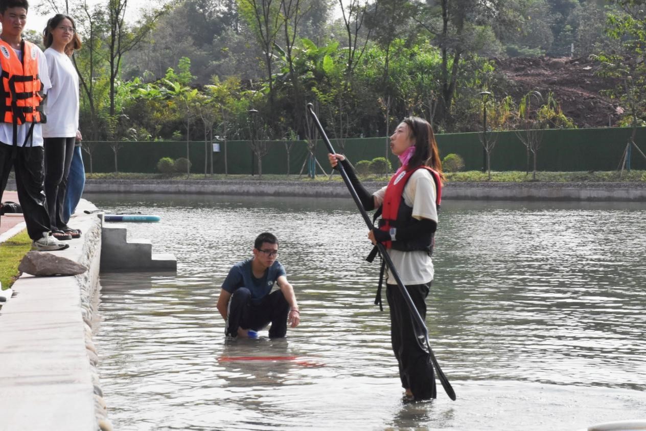 本次活动以小组形式开展,共分为5组,每组3人。活动开始前,指导老师王欣为参赛选手讲解浆板知识与运动技巧并强调自我安全保护,提高同学们的安全防护意识。在听完讲解后,同学们都穿戴好装备,摩拳擦掌,迫不及待的想要感受浆板运动的魅力。