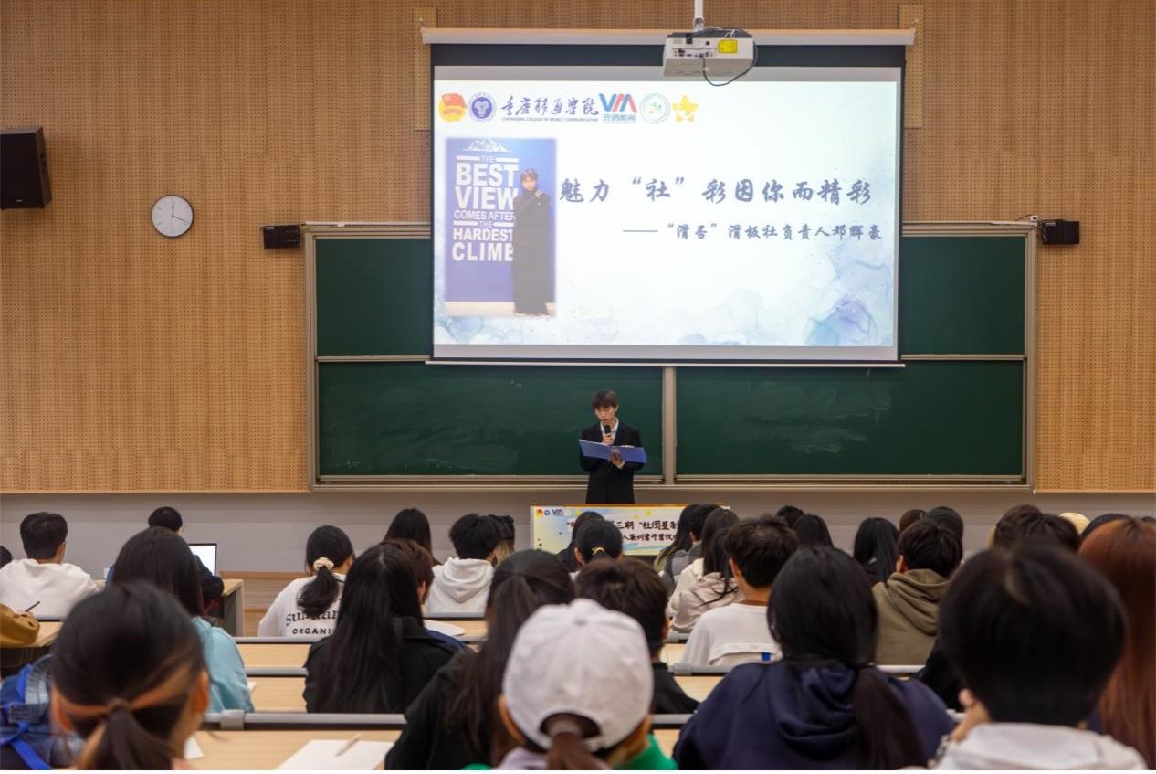 10月26日12:00“灯塔”之第三期“社团星制造”学生社团负责人集训营开营仪式在横山阶梯教室正式拉开序幕,莅临本次开营仪式的老师有青花墨字书画社指导老师胡垚老师,电影协会指导老师谭雪老师,校团委社团发展中心主任杨佳燕老师,校团委社团活动板块指导老师蒋莉老师。活动伊始由主持人致开场词,全体成员起立奏唱团歌。