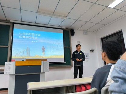 会议伊始,覃桂都教练简洁地进行自我介绍,以便大家对他有一个简单的了解。随后,覃教练播放了一段关于越野赛的视频,让大家对越野赛有一个更清晰的认知,并从什么是越野赛、什么是ITRA、参加越野赛要做哪些准备、参加越野跑有什么意义这四个方面,对越野赛的相关知识进行讲解。覃教练在每一个方面都讲得十分详细,同学们也听得很是认真。