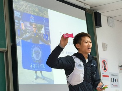 越野赛是在野外进行,安全问题是重中之重。宣讲会上,覃教练向同学们强调了越野赛中的安全注意事项。首先,介绍了药品以及食品的重要性,同时,覃教练结合自己越野赛的经历同学们向同学们介绍了各种药品的作用;其次,就是讲解一些常见的越野装备如:登山杖的使用、水袋的配备、急救毯和绷带的使用等。为同学们在老瀛山越野赛中奠定了更好的知识储备基础,让大家安全的参赛,并取得优异的成绩。