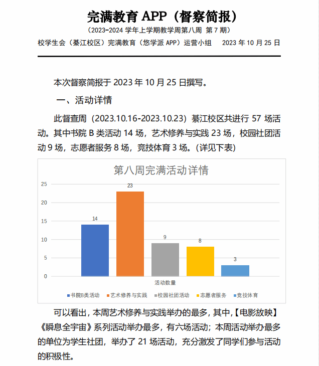 校学生会学习部,他们在完满教育“悠学派”APP常态化运营中,以“悠学派”为抓手,做好完满教育学分工作及活动质量规范督查工作,组建专业化运营团队并制定常态性运行机制,使悠学派管理运营更加规范化,为此每周更新督察简报,目前已8期,每月更新学分公示,目前已2期。作为同学们的完满教育学分保卫者,他们始终把同学们的使用感放在第一位,以打造一个更好的平台,让同学们能够积极的参加到完满教育日常活动当中去展现自我、锻炼自我、实现自我。不仅如此,他们还在每一次的工作中总结经验,努力发挥自己的才干,并将我们的赤诚之心融入到学习与生活中,更好地服务于同学。