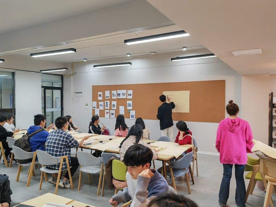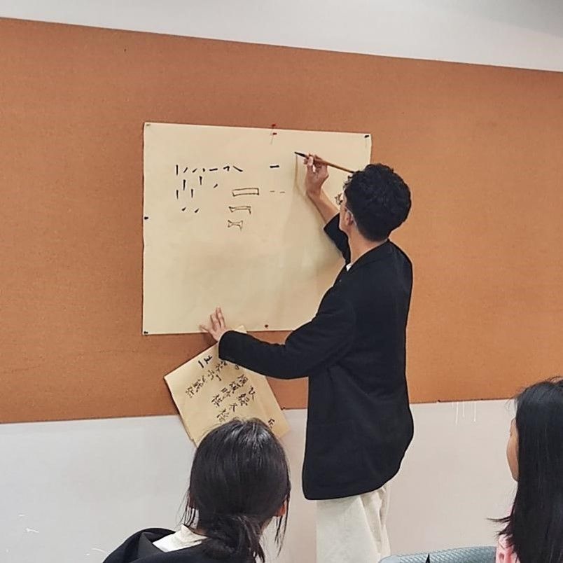 社长樊源杰在第1期笔画结构的基础上,对字体类别进行了更详细的讲解,让每一排的同学都近距离观察社长的笔法,同时向同学们演示正确的书写笔画。社长示范结束,同学们展开宣纸倒墨酝笔后,开始聚精会神地练习书写。社长则仔细观察每个人的书写姿势,并对有问题的同学及时进行纠正。此次体验课想通过同学们亲身体验软笔书写,让同学们感受到书画背后蕴含的艺术之美,对于书画的文化与审美价值也有了更为清晰的认知。