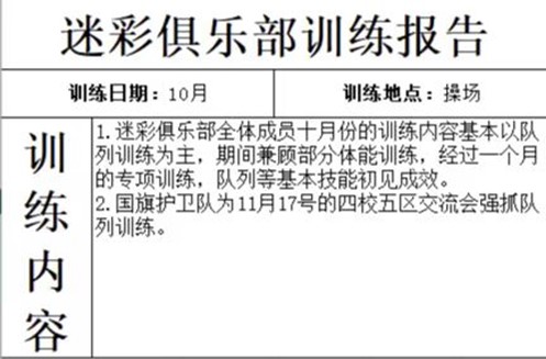 十月份的时间犹如白驹过隙,但是在这一个月中迷彩俱乐部注入了新的血液,也在一次次的训练和活动中,让新老成员凝聚在了一起,增进了对迷彩俱乐部的认同感和归属感,也对自己的未来更加的坚定,坚定自己未来的目标。青春似火,风华正茂,希望迷彩俱乐部的同学可以在风华正茂的青春里感谢彼此的相遇,怀着对迷彩俱乐部美好未来的憧憬,一起携手并进。