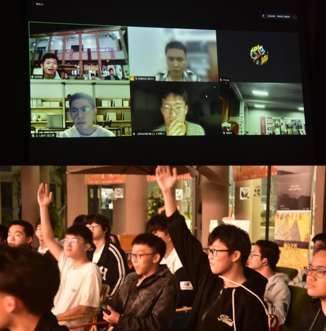 正值青春时,何不随风行。11月8日晚上18:30,第一天的放映活动拉开了序幕,电影协会与冇MAO青年影像周合作,于古剑书院中庭与玉棠书院中庭共同举行了影像周获奖、提名短片高校专场放映活动。在本场放映中,同学们欣赏到了《细雨淋湿的路上》《廿廿》《宁隐》《无人接听》四部短片,不论是作品主题还是表现风格,都让同学们耳目一新。放映结束之后,电影协会特邀主办方及《细雨淋湿的路上》的导演、编剧王鸿隆及《无人接听》导演刘江勇进行了线上交流,这也是电影协会第一次邀请到导演在放映结束后与同学们进行交流,在与两位导演交流的过程中,为同学们解开了很多关于影片的疑惑,同时也让同学们感受到了青年导演独特的思想魅力与表现风格。导演交流结束后,主办方也对冇(MAO)青年影像周及其机构做了介绍,希望同学们了解到更多关于电影的活动及升学、就业渠道。和导演面对面交流仿佛有一位来自光影世界的领路人,带领我们从更加专业、更加丰富多元的角度认识电影、了解电影。观影结束后,同学们纷纷表示希望有更多此类活动。