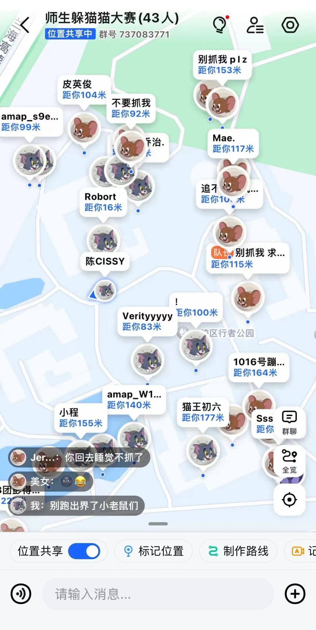 真人猫抓老鼠游戏非常有趣刺激,在游戏中,起初老师需要扮演一只狡猾的猫,抓住我们所扮演的老鼠。这大大拉进了师生们的关系,增强了师生们的友谊。作为猫,需要时刻保持警觉并灵活移动,以避免被老鼠发现。通过敏锐的洞察力快速发现老鼠并实施抓捕。通过高德地图的定位也可快速发现我们藏匿的地点,我们同样也可以看到猫的位置,这大大提高了游戏的可玩性,增加了游戏的趣味性,带给我们更自由的游戏玩法。在游戏中,我们也要灵活移动、保持耐心并与队友合作。通过不断尝试解锁游戏更多的玩法,我们都很享受这个游戏带来的乐趣。