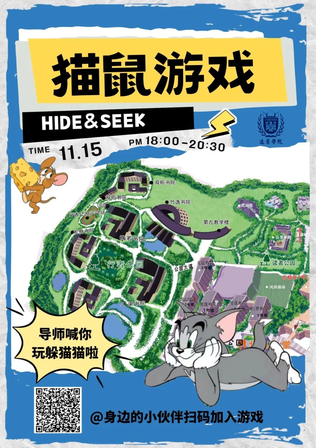 11月15日晚,由远景学院陈曦、吴金燠、王楚涵三位导师联合策划,举办了一场“师生猫鼠游戏”活动。活动预热后,收到了同学们的热烈反响,不少同学在抖音和小红书上已有了解,都跃跃欲试!总计有60名学生报名参与活动。