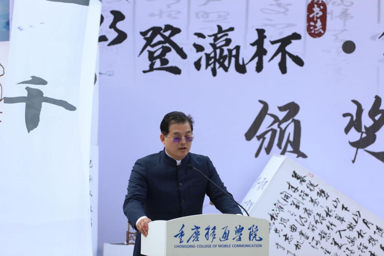经过激烈的角逐后,下午16:00,在古剑书院中庭2023登瀛杯·全国大学生书法邀请赛颁奖仪式如期进行。重庆移通学院常务副院长、綦江校区管委会主任王永周校长诚挚的向来校的各位领导嘉宾及参与比赛的各高校师生代表致欢迎辞,多彩綦江,如来如愿。随着2021年新校区的落成,学校办学规模不断扩大,办学特色鲜明,人才培养措施有力,培养造就了大批优秀人才,为地方经济社会发展做出了应有的贡献。学校秉承乐教、乐学、创造、创业的校训精神,创新探索“四位一体+双院制”特色人才培养体系。在“完满教育”的支持下各级各类社团活动、大型赛事接踵而至,为我校学子提供了丰富的第二课堂实践机会。而后重庆移通学院校领导李文豹、梁少锋及专家评审团代表为本次书法邀请赛一二三等奖及优秀奖的同学颁奖。在书法爱好者,来自我校“青花墨字”书法社负责人樊源杰的分享中,表示非常感谢学校为书法爱好者提供一个展示自我的平台,希望未来将持续开展此类比赛。仪式最后,中国硬笔书法家协会副秘书长、重庆市硬笔书法家协会主席蔡锡田发表讲话,表示能借由此次比赛传承优秀传统书法文化,共同为推进优秀书法文化进高校贡献力量,在未来也将会持续与移通学院加强合作力度,为更多的书法爱好者提供更精彩的赛事活动!