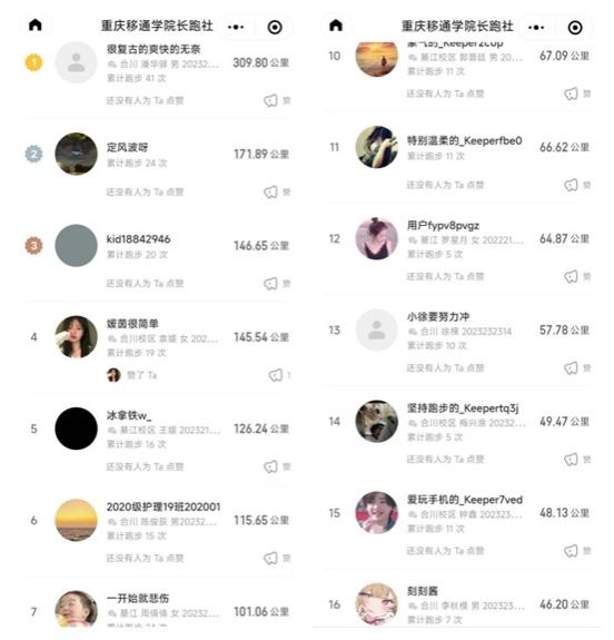 有慢速前进、健康运动的同学,那自然也不缺追求极速,刷新pb,猛堆跑量的爱跑者,他们有的配速进了四分以内,有的经过一月有余的训练成功刷新自己最好的记录,有的月跑量超过三百公里,整个活动中总跑量高达六百公里!经过详细数据核对与检测,确认这些跑者都是“大神”无疑。其中代表性人物有合川校区潘华驿、袁媛、陈俊荻,綦江校区陈豪、王媛、周倩倩。