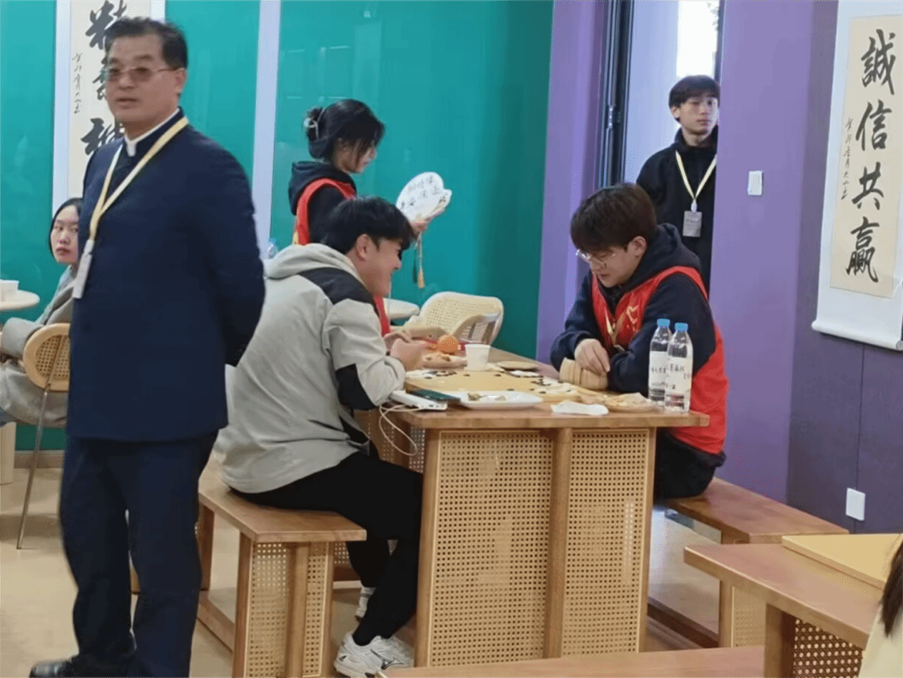 在活动中,参与同学们选择了自身感兴趣的棋盘,杯放桌旁,彼此对弈。晚一步到来的同学,就手持茶杯,边饮边看,也乐在其中。在对弈期间,一来一往,每桌同学的神情动作各不相同,有举棋不定、屏气凝神、悔之不及等情况。但这时喝上一口茶,提神而惬意,巧妙应对逆局,让棋局变的你来我往。