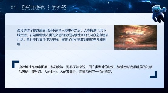 磨难不可避免,希望却仍永存。由高志昂同学线上进行分享《流浪地球2》,高同学分别从电影介绍、成功原因、生活启示等方面对电影内容进行了剖析,高同学说到,电影充满着中国人独有的人文追求,从“家庭”延展到“家国”再到“家园”,同时又在影片中开拓出了中国式的亲情关系和根植中国人心的“恋土”情怀。高同学同样激励大家作为新时代的接班人一定要有文化的自觉和自信,因为中国传统文化的内核里有情义、有情结、有情怀。这也是电影想要让大家学习领悟到的。