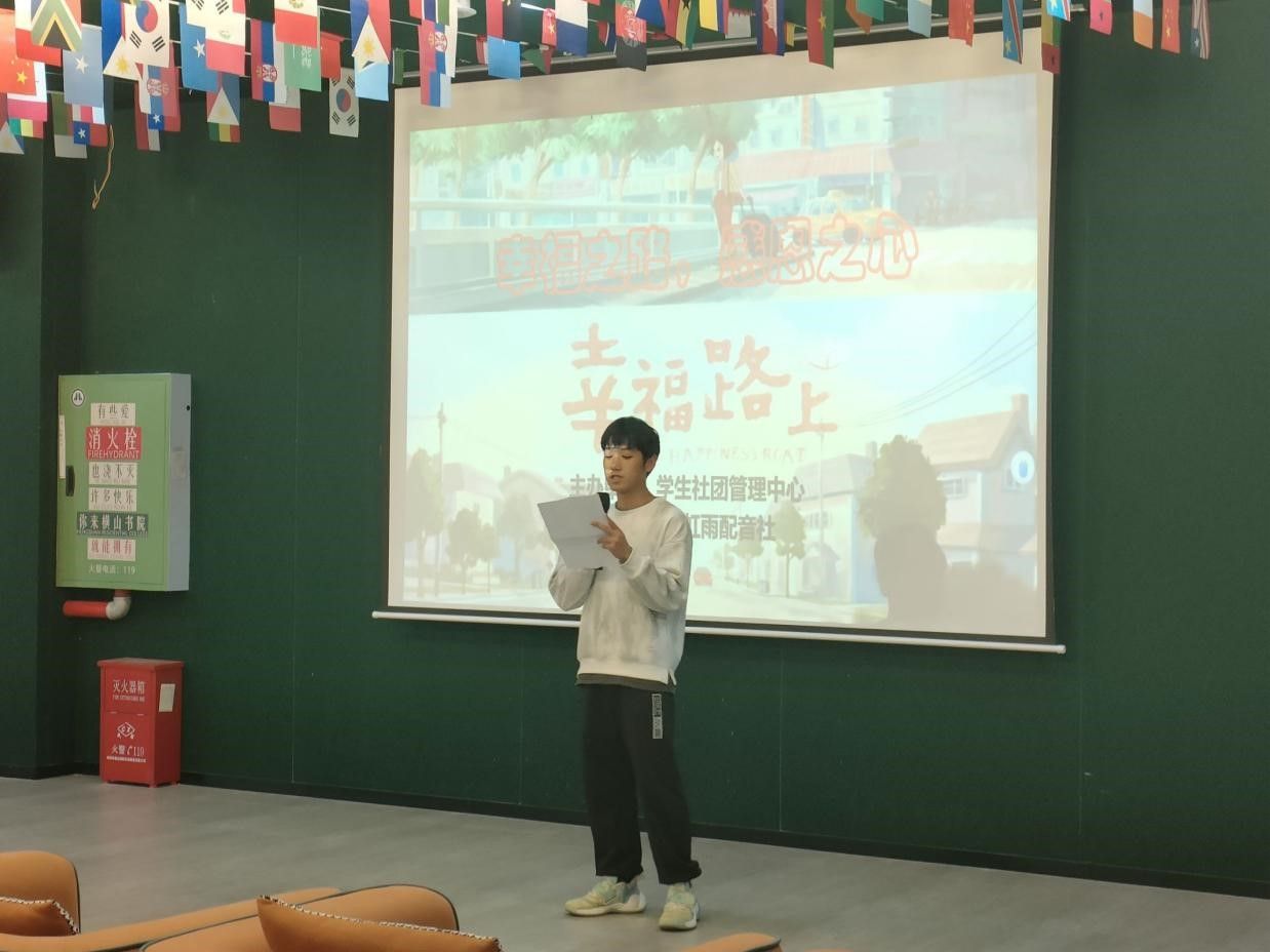 岁月无痕,感恩节将至,为延续中华民族几千年的优良传统美德——感恩,让同学们有机会感谢父母、感谢命运、感谢遇见,虹雨配音社于2023年11月22日横山流光多功能影音室,特此举办了 “幸福之路,感恩之心”观影活动。此次感恩节观影活动以“感恩”为主题,通过观看影片《幸福路上》,让同学们去体会其中的温情和感恩,并希望通过此影片让同学们学习到更多的配音知识和技巧。