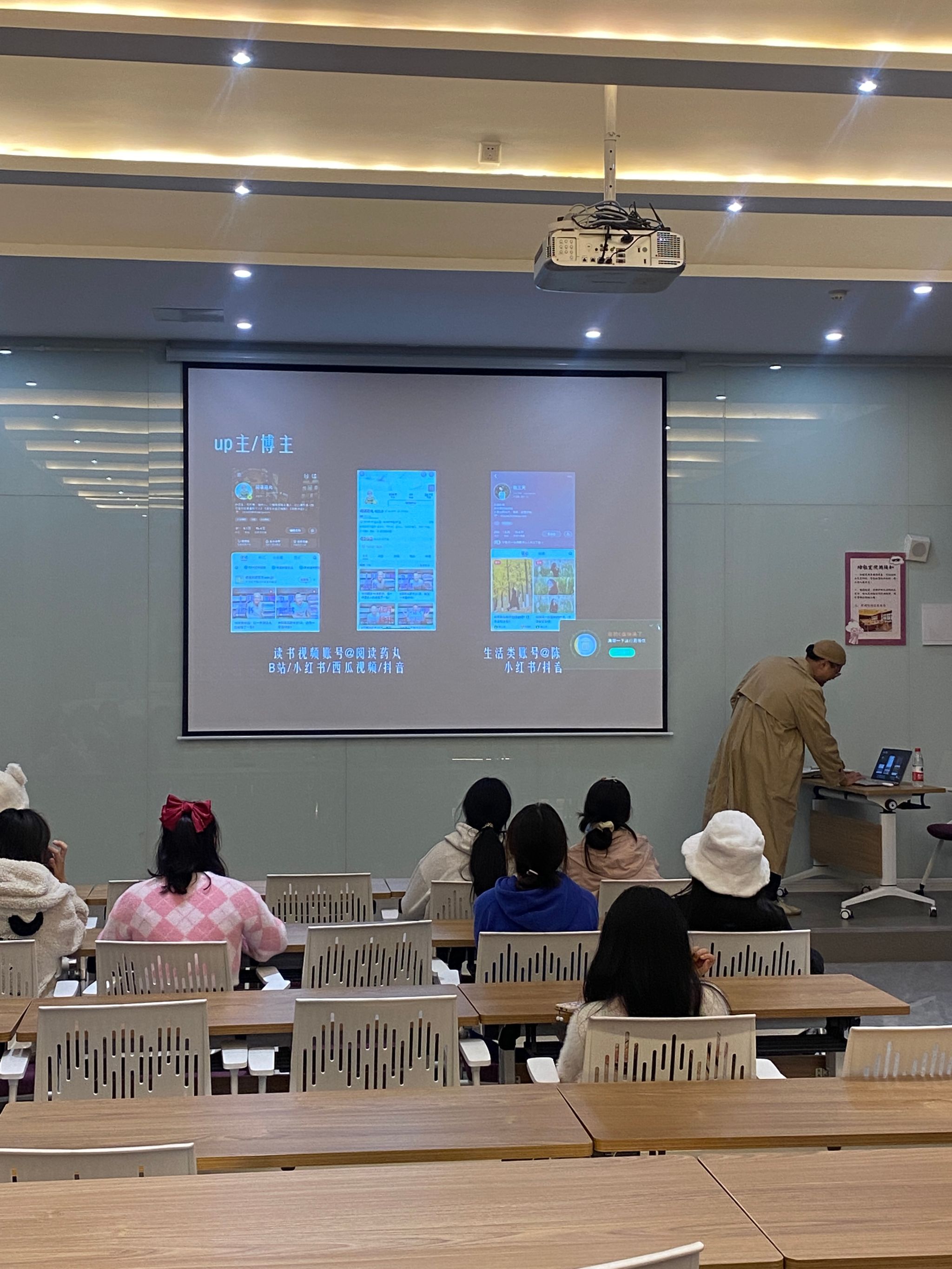 11月22日,19时。作家兼博主江凌于观云书院带领同学们一起探索新的世界,生动的为同学们总结了当下热门的视频平台各自的优势。例如长视频的b站,短视频的抖音,图文并茂的小红书。江凌老师表示b站的创作难度高,变现难,竞争较小,对于新手不友好。抖音短视频虽然创作难度小,但竞争强,进入赛道的人数少。而小红书的创作难度适中,更适合刚接触的同学们。
